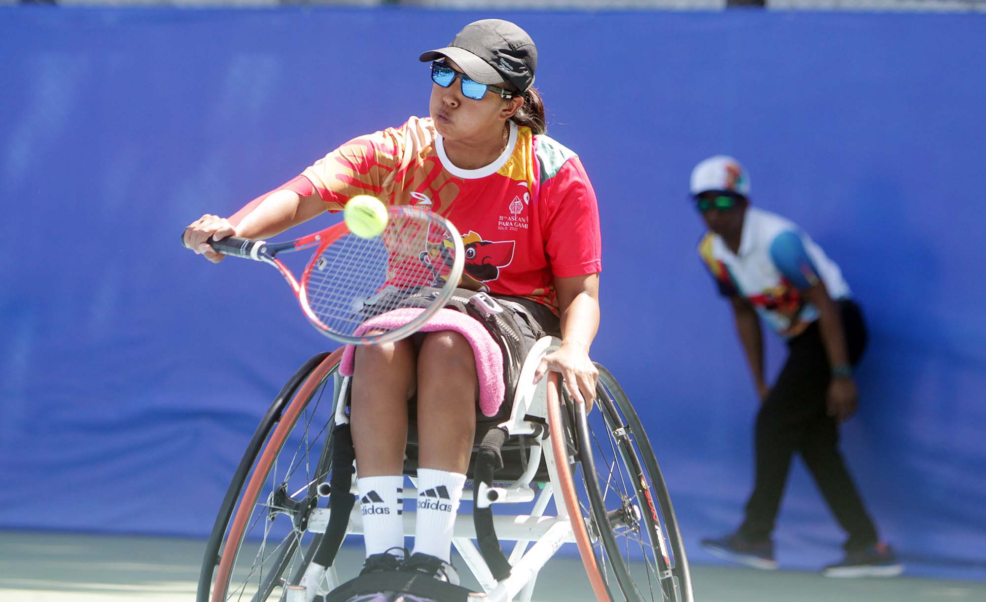 Petenis kursi Roda Putri Indonesia, Ndaru Patma Putri mengembalikan bola di cabang Wheelchair Tennis 11th ASEAN Para Games Solo 2022 (4/8/2022) di Lapangan Tenis Manahan. Foto : HO/INASPOC/Sportsmoment/Husni Yamin