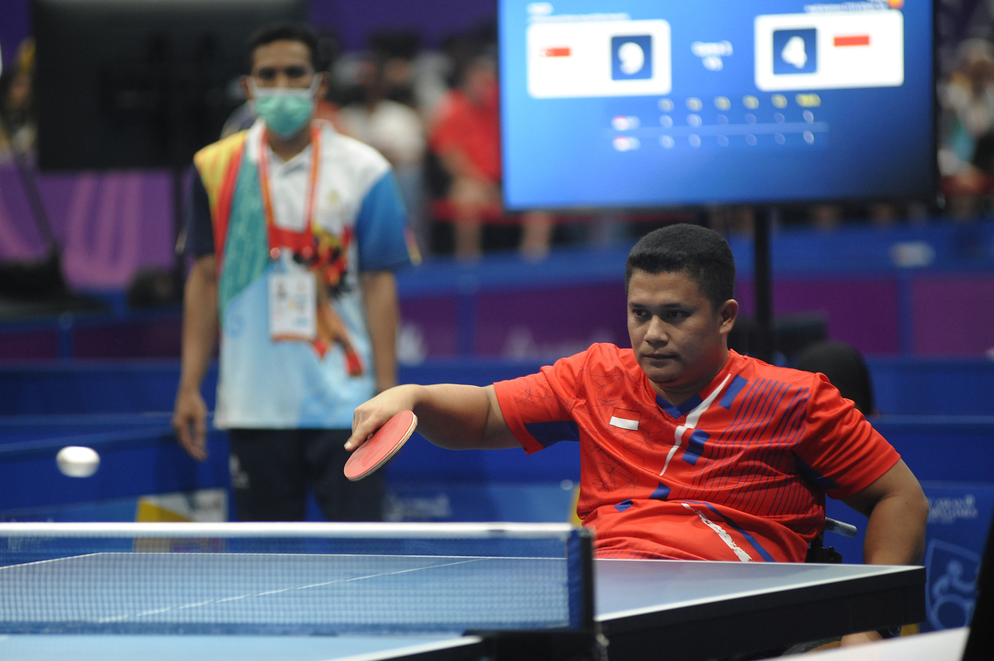Bertanding di kelas 3 Men Single Para Tenismeja Andi Santoso Indonesia kalah atas Muhammad Dinie Asyraf Bin Huzaini asal Singapore, 9-11, 11-7, 11-5, 11-7. 11th ASEAN Para Games 2022, yang berlangsung di Solo Techno Park 4 Agustus 2022. Foto : HO/INASPOC/Sportsmoment/Sofyan Adi.