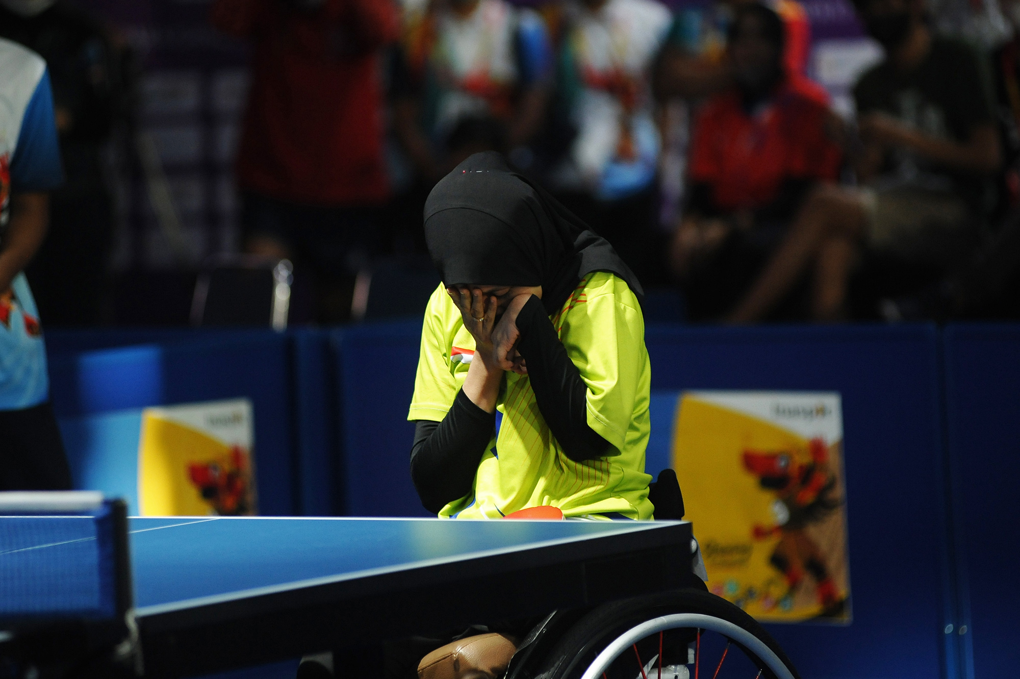 Leli Marlina, atlet Para Tenismeja Indonesia menangis haru, setelah mengalahkan wakil Thailand Pangwas Sringam di kelas 5 Women Single. 11th ASEAN Para Games 04 Agustus di Solo techno Park. Foto : HO/INASPOC/Sportsmoment/Sofyan Adi.