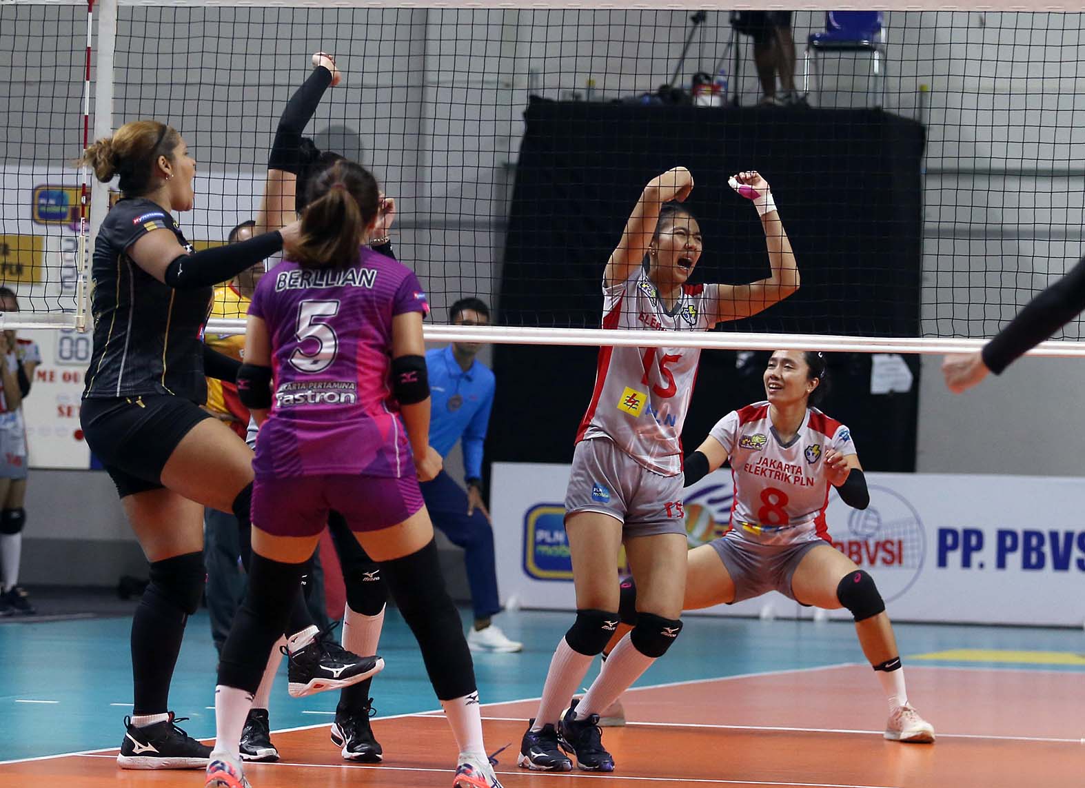 Tim bola voli putri Jakarta Pertamina Fastron berhasil menang atas Jakarta Elektrik PLN dengan skor 3-1 pada pertandingan Proliga 2022 putaran pertama yang berlangsung di GOR Padepokan Voli Jenderal Polisi Kunarto, Sentul, Minggu (16/1/2022). (Foto : Erly Bahtiar/Sportsmoment.id)