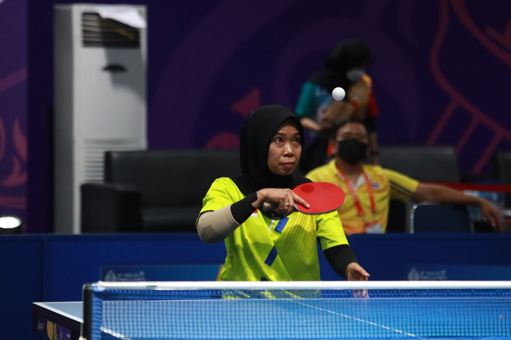 Paratenis Meja Indonesia Tarsilem ( Ina ) berhasil dikalahkan WIJITTRA JAION asal Thailand dalam kelas 4 WOMAN SINGLE di 11th ASEAN Para Games 2022 di di Solo Techno Park, Kamis (4/8/2022). Foto : HO/INASPOC/Sportsmoment/Sofyan Adi.