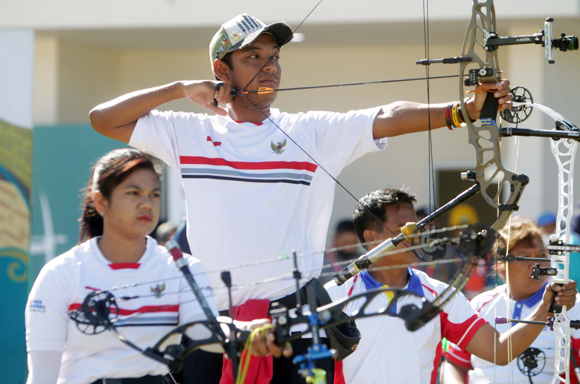 Pasangan atlet Para Panahan Putri Indonesia, Ken Swa Gumilang (kanan) bersiap membidik sasaran final cabang Para Archery 11th ASEAN Para Games Solo 2022 di Lapangan Panahan Kota Barat, Solo (5/8/2022). Indonesia gagal merebut medali perunggu di nomor Compound Open Mix Doubles Team. Foto : HO/INASPOC/Sportsmoment/Husni Yamin