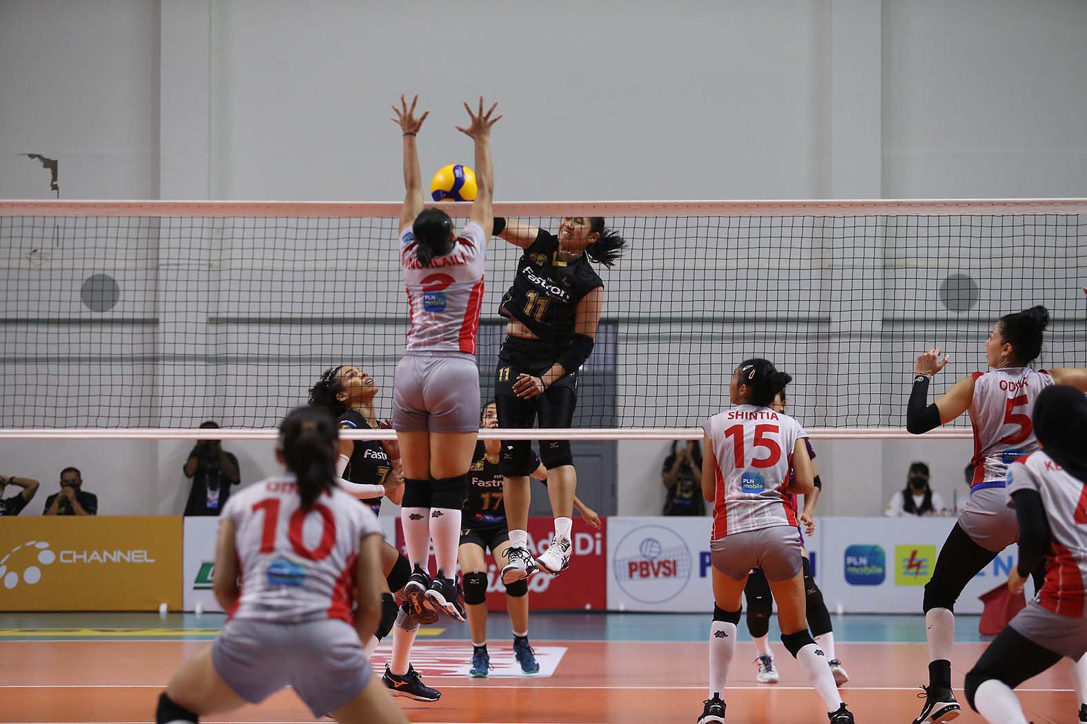 Jakarta Pertamina Pertamax berhasil menang atas Bogor Lavani dengan skor 3-1. Pertandingan Proliga 2022 putaran pertama yang berlangsung di GOR Padepokan Voli Jenderal Polisi Kunarto, Sentul, Minggu (16/1/2022). (Foto : Erly Bahtiar/Sportsmoment.id)