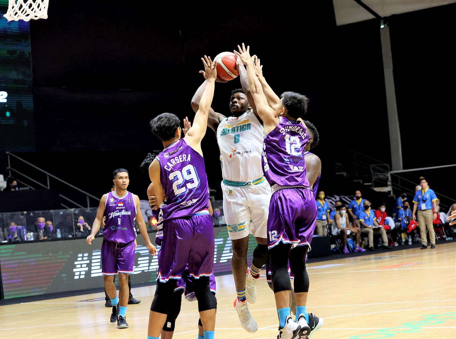 Satya Wacana Salatiga melawan Amartha Hangtuah Jakarta pada pertandingan Seri 1 Jakarta Indonesian Basketball League (IBL) 2022 di Hall Basket GBK, Jakarta, Minggu (16/1/2022). Satya Wacana Salatiga kalah oleh Amartha Hangtuah Jakarta dengan skor 68-75. (Photo : Bobby Arifin)