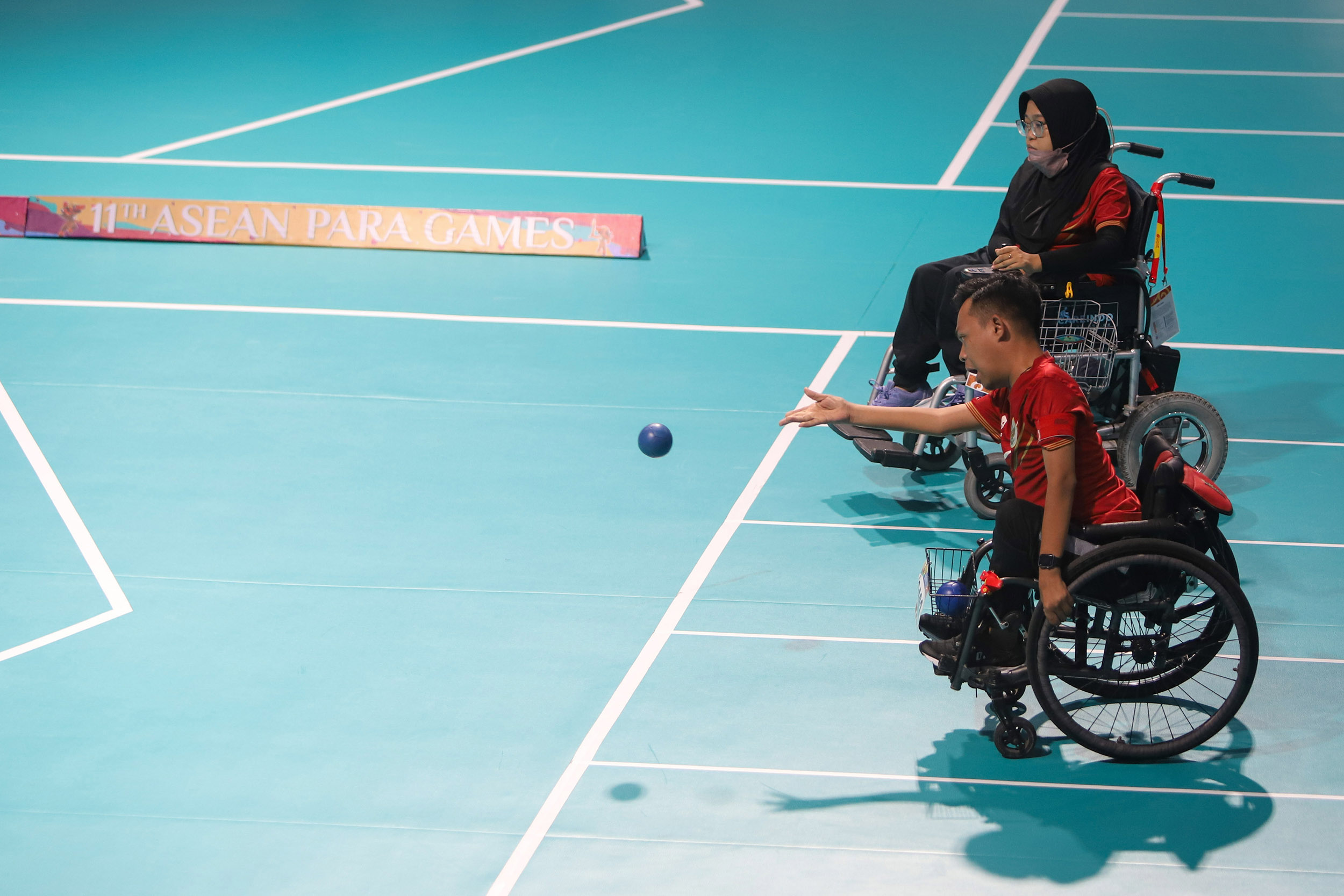 Indonesia Kalah 1-6 dari Thailand di Boccia APG 2022. Atlet boccia Indonesia Fendy Kurnia Pamungkas dan Wening Prabawati bersiap melempar bola saat bertanding melawan atlet boccia Thailand Chalisa Khiawjantra dan Pornchok Larpyen pada nomor Pairs BC 4 11th ASEAN Para Games 2022 di di FKOR UNS Sports, Solo, Jawa Tengah, Jumat (5/8/2022). Indonesia kalah dari Thailand dengan skor 1-6. Foto : HO/INASPOC/Sportsmoment/Muhamad Solihin