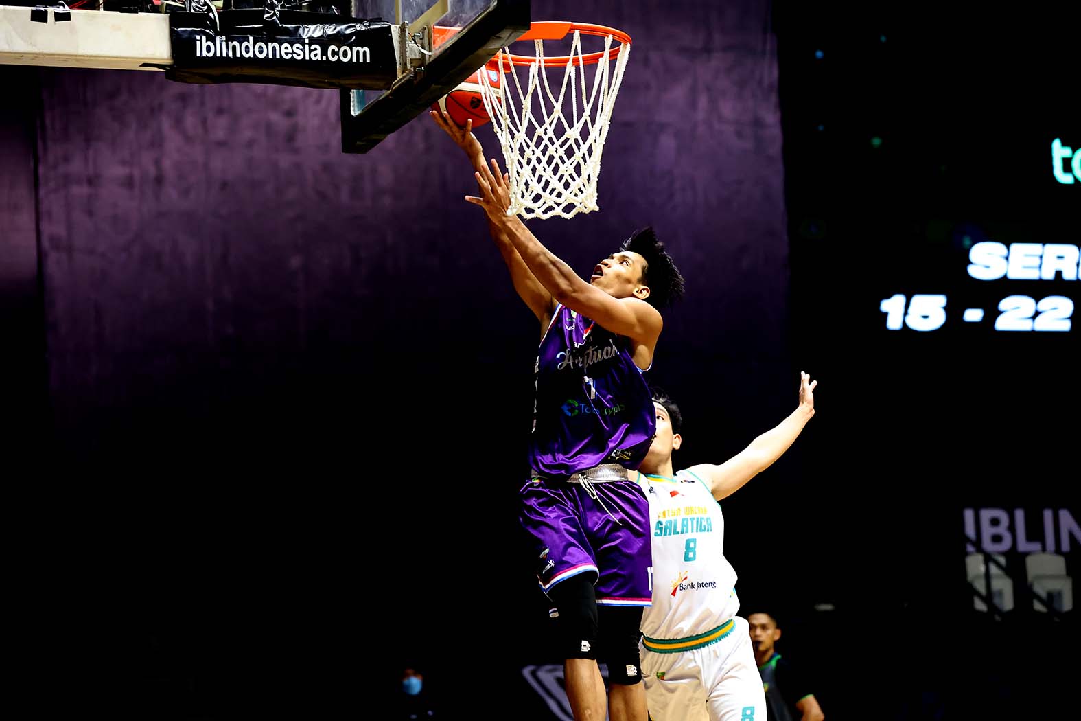 Fisyaiful Amir (17) pebasket Amartha Hangtuah Jakarta berupaya memasukan bola ke arah ring lawan saat Satya Wacana Salatiga melawan Amartha Hangtuah Jakarta pada pertandingan Seri 1 Jakarta Indonesian Basketball League (IBL) 2022 di Hall Basket GBK, Jakarta, Minggu (16/1/2022). Satya Wacana Salatiga kalah oleh Amartha Hangtuah Jakarta dengan skor 68-75. (Photo : Bobby Arifin)