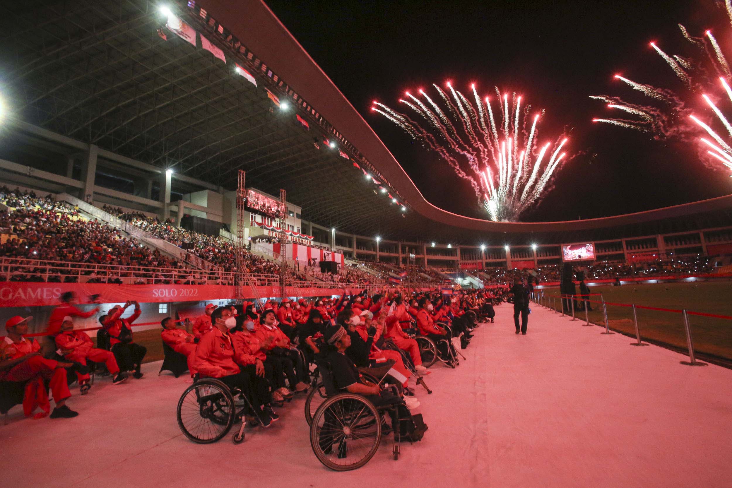 Sejumlah atlet menyaksian kembang api saat upacara penutupan 11th Asean Para Games 2022 di Stadion Manahan, Solo, Jawa Tengah, Sabtu, 06 Agustus 2022. Foto : HO/INASPOC/Sportsmoment/Agoes Rudianto