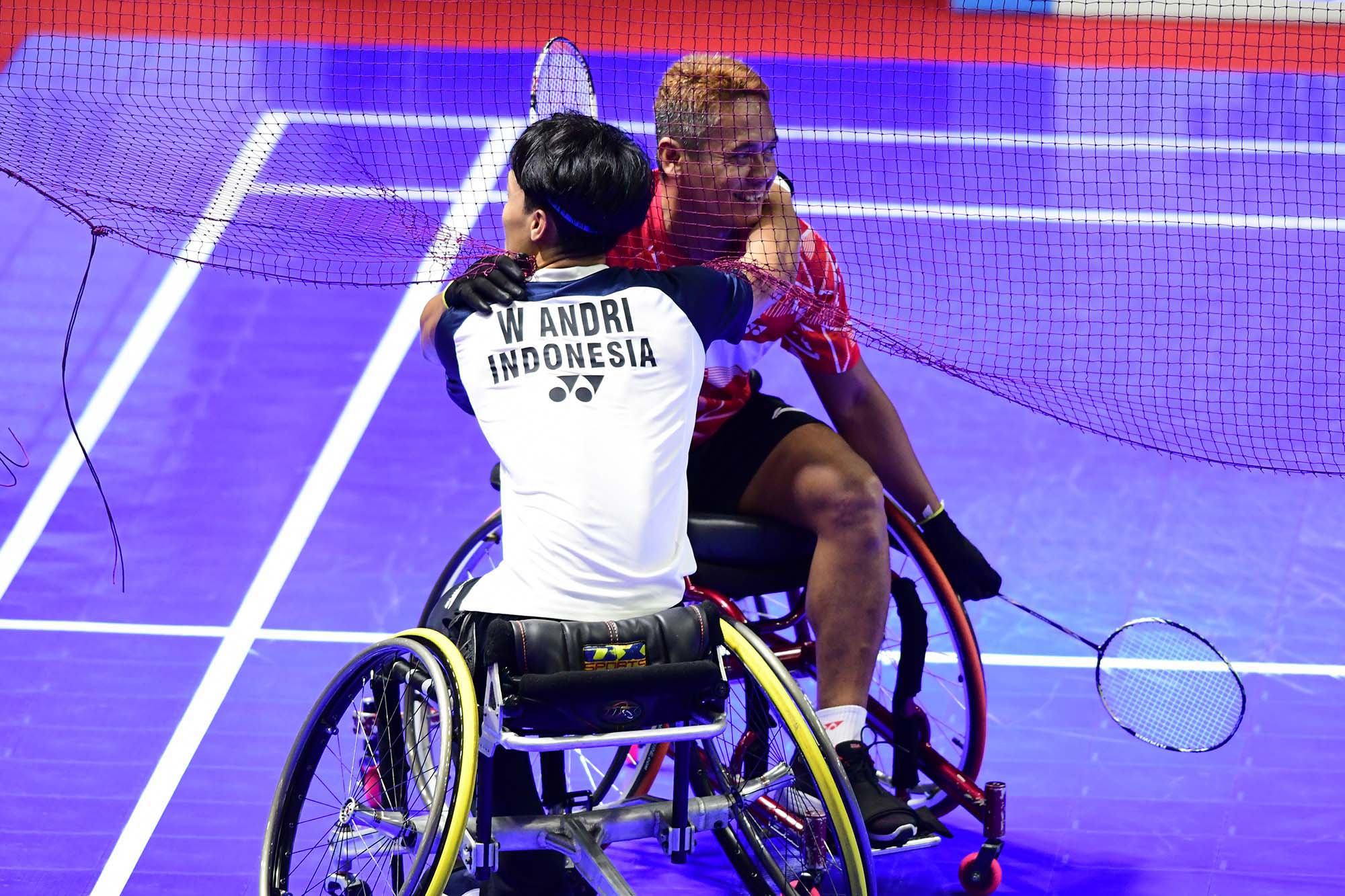 Pebulutangkis Wiwin Andri dan Agus Budi Utomo berpelukan setelah partai final sesama Indonesia nomor tunggal putra WH2 ASEAN Para Games 2022 di Edutorium UMS, Sukoharjo, Jawa Tengah, Jumat (5/8/2022). Partai ini dimenangkan oleh Wiwin Andri dan berhak atas medali emas.Foto :HO/INASPOC/Sportsmoment/RIZAL ADI DHARMA