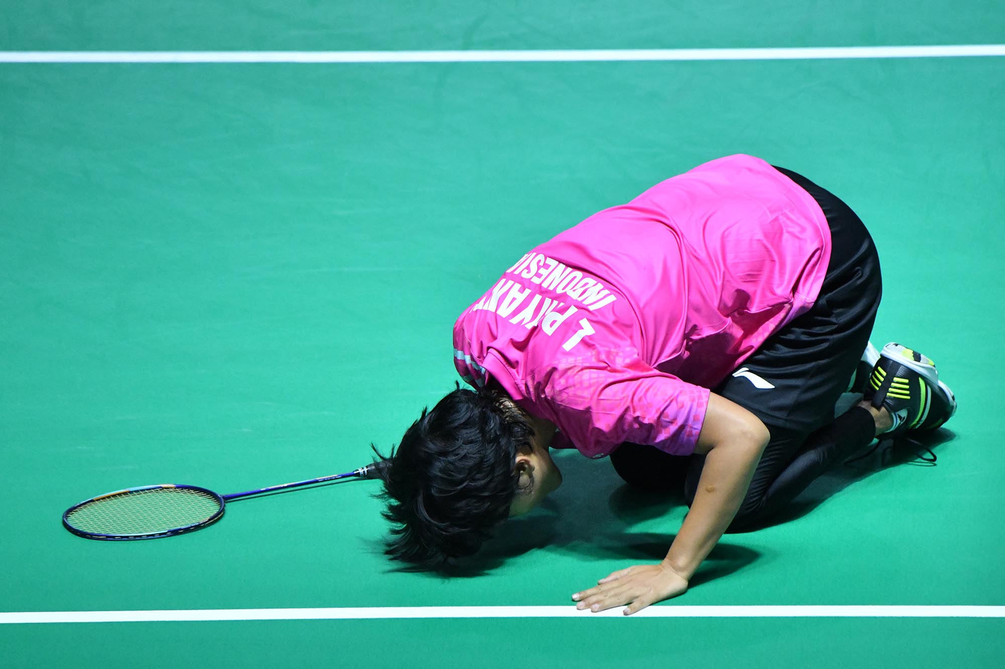 Atlet Indonesia Lia Priyanti melakukan selebrasi setelah pertandingan final nomor tunggal putri SL4 11th ASEAN Para Games melawan Srinavakul Chanida asal Thailand di GOR Edutorium UMS, Sukoharjo, Jawa Tengah, Jumat (5/8/2022). Lia berhasil meraih medali emas lewat kemenangan dua set langsung 22-21, 21-19.