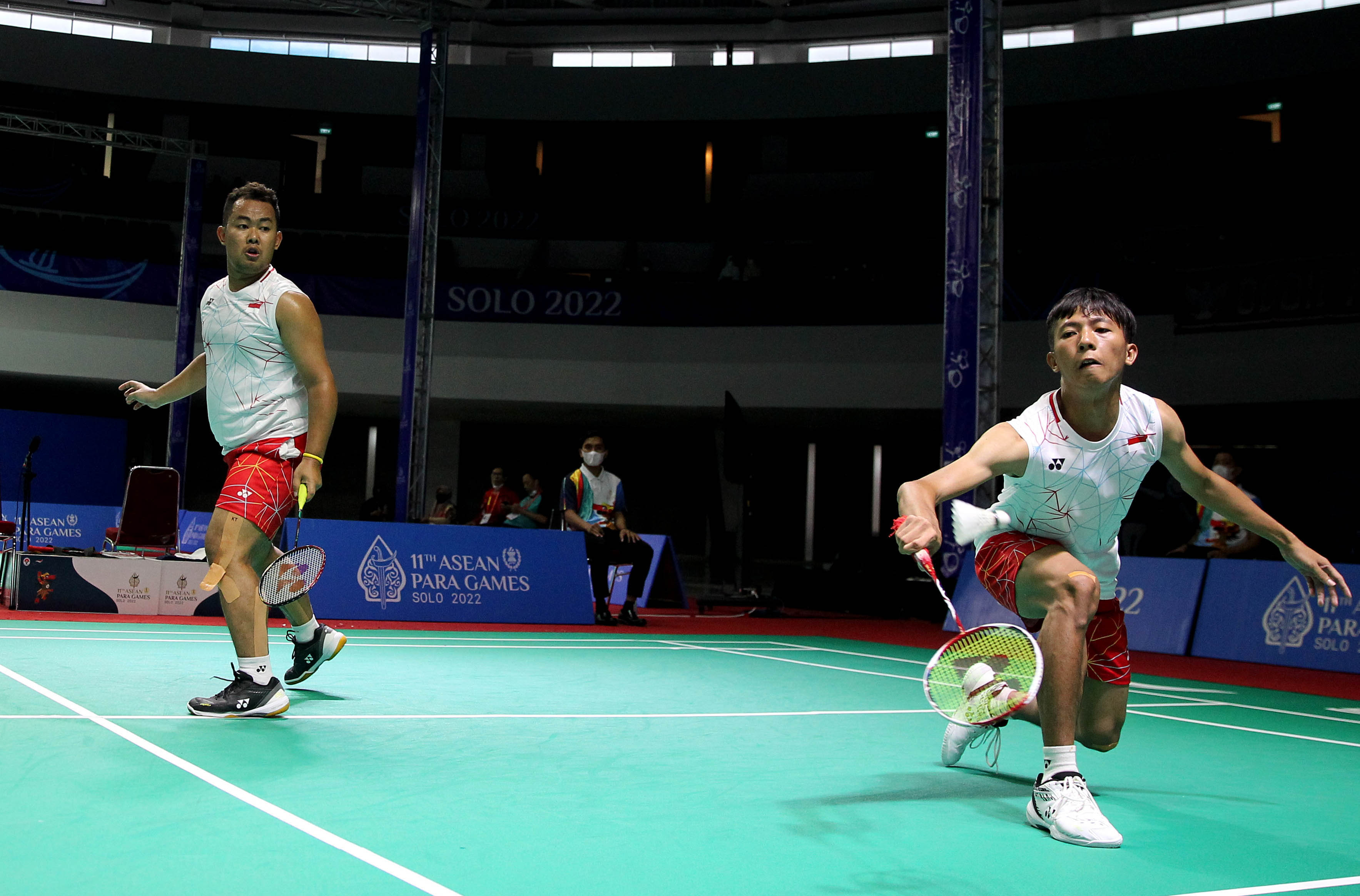 Pebulutangkis Indonesia Dheva Anrimusthi dan Hafiz Briliansyah Prawinegara dalam aksinya saat pertandingan di nomer Ganda Putra pada 11th ASEAN PARAGAMES 2022 di Auditorium Universitas Muhammadyah Surakarta, Solo, Jumat, 5/08/2022. Foto :HO/INASPOC/Sportsmoment/Ardy Alvez
