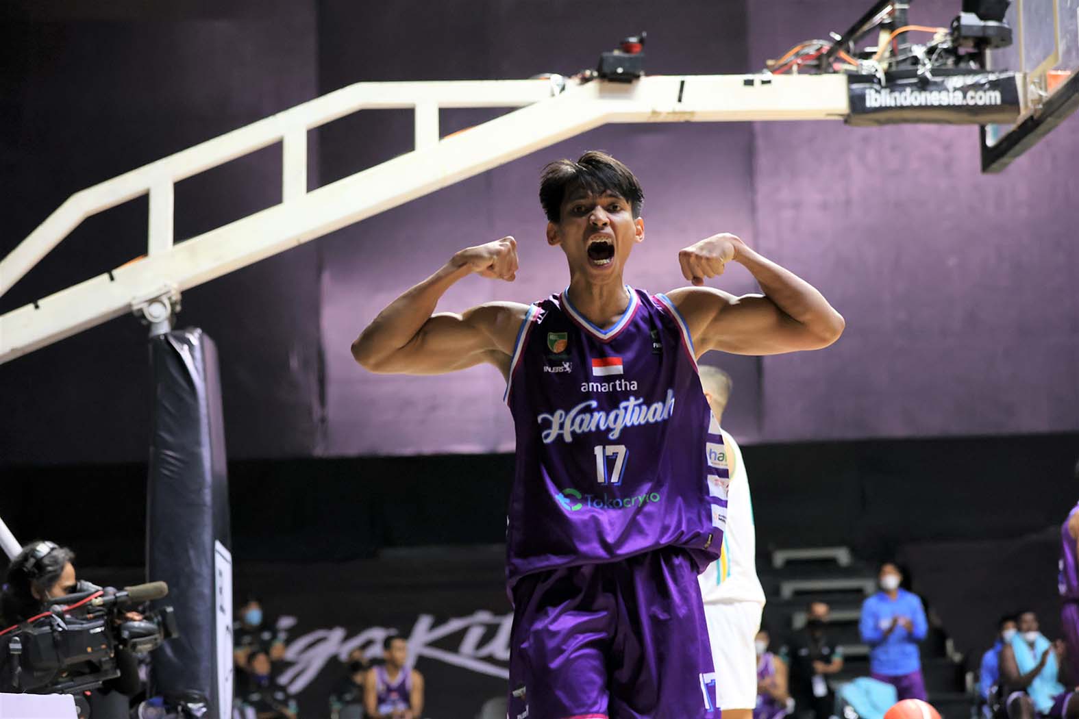 Fisyaiful Amir (17) pebasket Amartha Hangtuah Jakarta meluapkan emosinya setelah berhasil memasukan bola ke ring lawan saat Satya Wacana Salatiga melawan Amartha Hangtuah Jakarta pada pertandingan Seri 1 Jakarta Indonesian Basketball League (IBL) 2022 di Hall Basket GBK, Jakarta, Minggu (16/1/2022). Satya Wacana Salatiga kalah oleh Amartha Hangtuah Jakarta dengan skor 68-75. (Photo : Bobby Arifin)