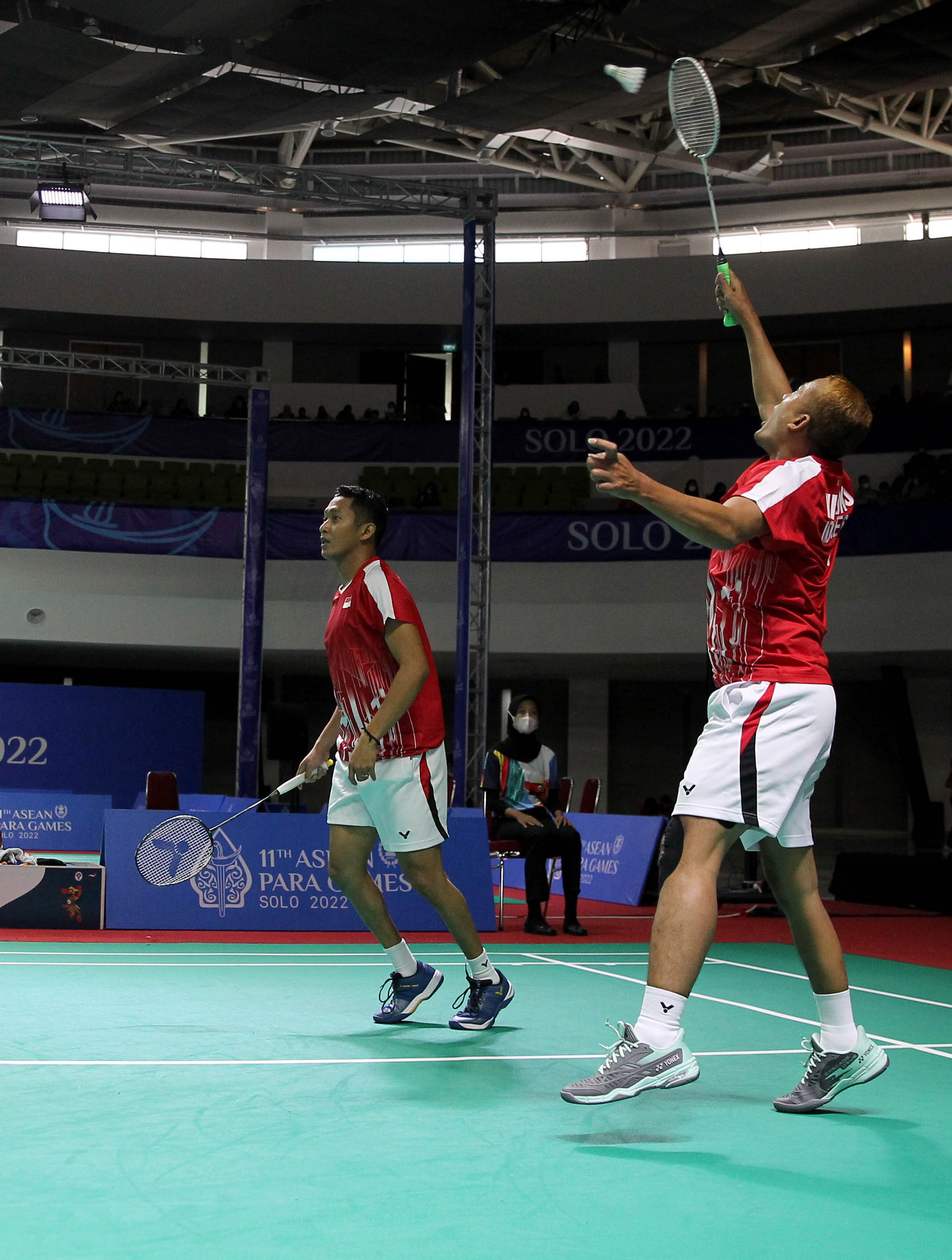 Pebulutangkis Indonesia Dwiyoko dan Fredy Setiawan dalam aksinya saat pertandingan di nomer Ganda Putra pada 11th ASEAN PARAGAMES 2022 di Auditorium Universitas Muhammadyah Surakarta, Solo, Jumat, 5/08/2022.Foto :HO/INASPOC/Sportsmoment/Ardy Alvez