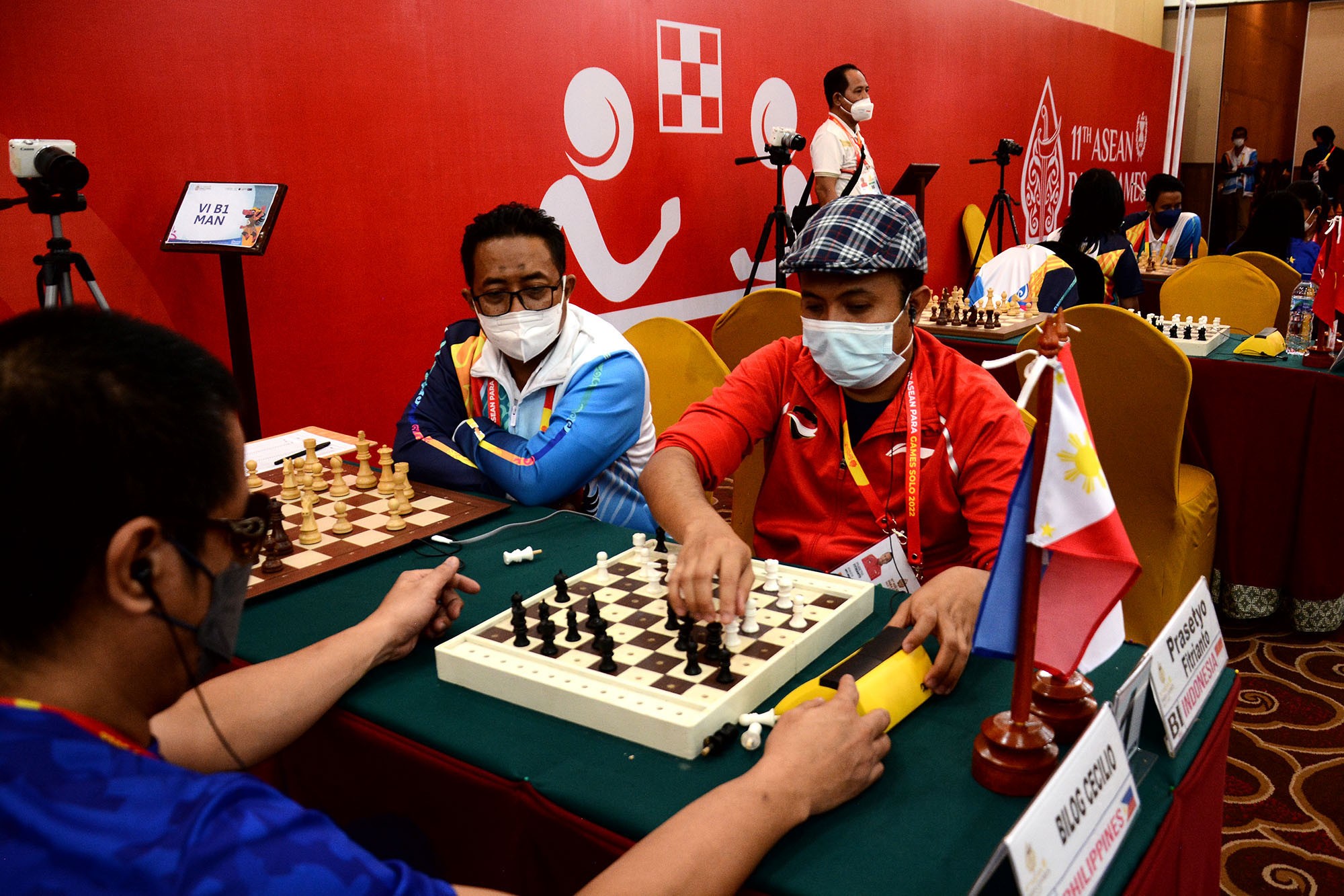 Pecatur Putra Indonesia Prasetio Fitrianto saat turun melawan Cecilio Bilog dari Philippines dalam nomor Men's Individual Blitz Chess B1, ASEAN Paragames 2022, di Hotel D'Wangsa, Sukoharjo, Jumat (5/8). Prasetio Fitrianto berhasil menang dan mendapatkan Medali emas. Foto : HO/INASPOC/Sportsmoment/YTS
