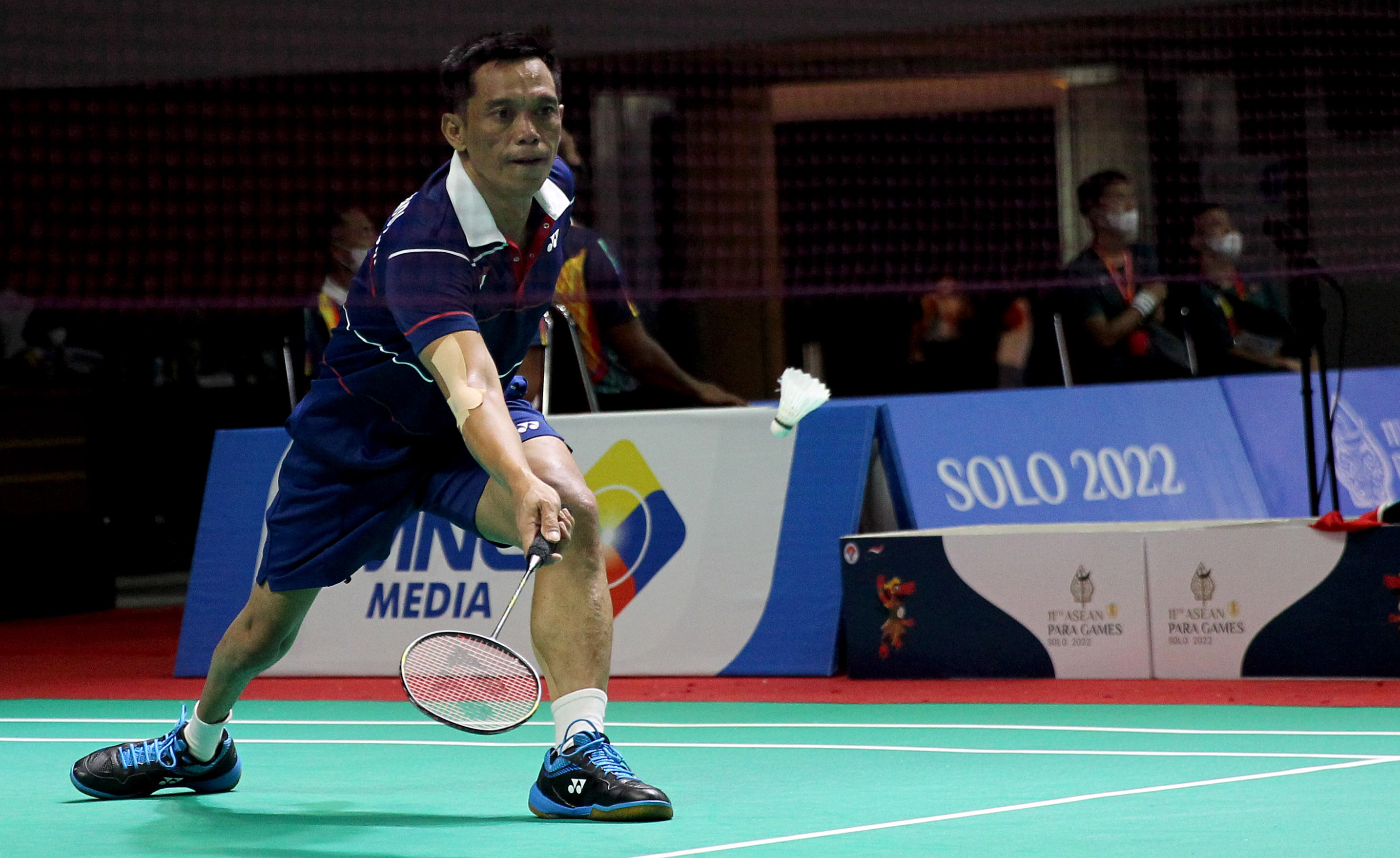 Pebulutangkis Indonesia Ukun Rukendi dalam aksinya saat pertandingan parta final di nomer Perseorangan pada 11th ASEAN PARAGAMES 2022 di Auditorium Universitas Muhammadyah Surakarta, Solo, Jumat, 5/08/2022.Foto :HO/INASPOC/Sportsmoment/Ardy Alvez