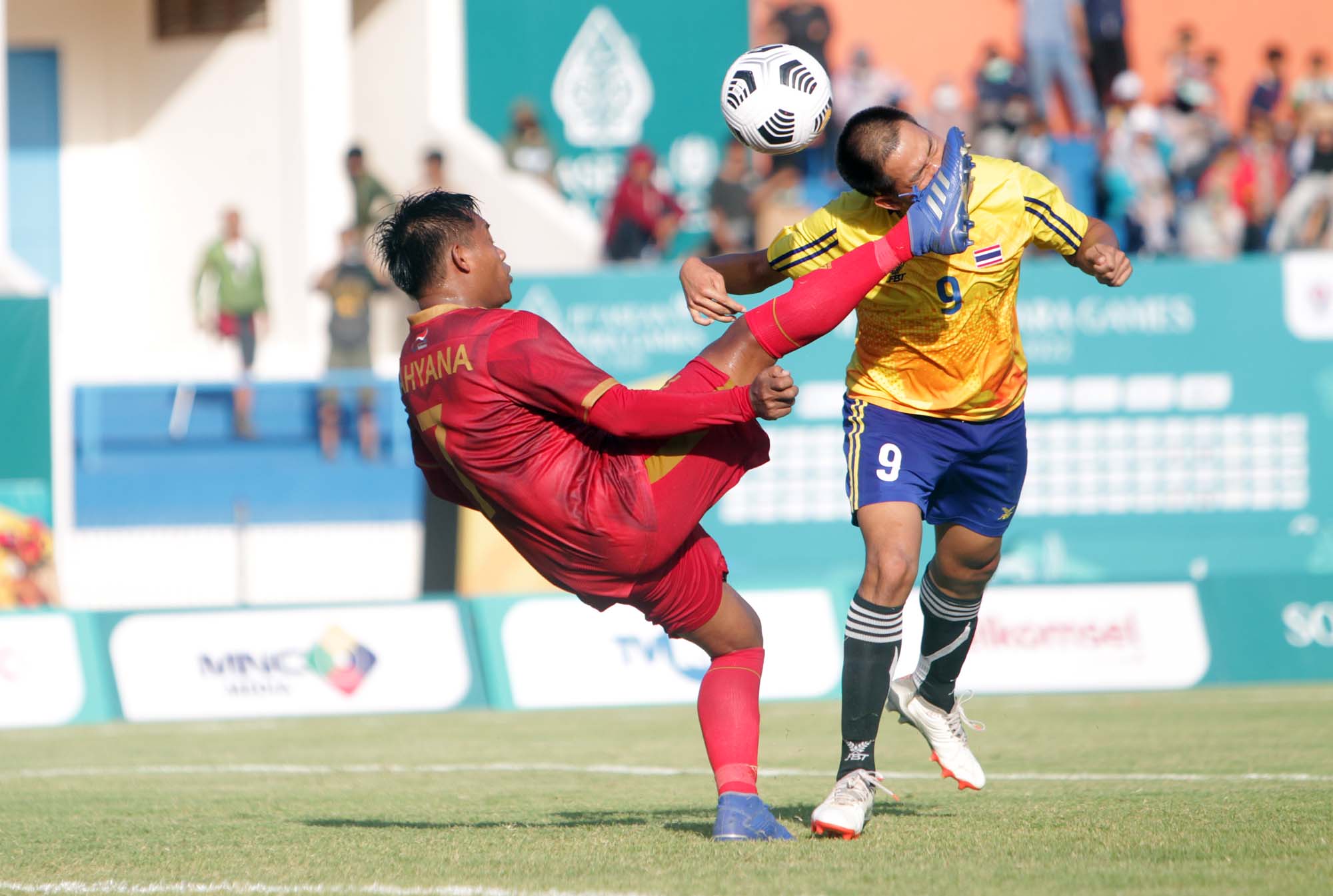 Pemain Para Sepakbola Indonesia, Cahyana (kiri) berebut bola dengan pemain Thailand dalam final CP Football 11th ASEAN Para Games Solo di Stadion UNS (5/8/2022). Di final Indonesia harus mengakui keunggulan Thailand dengan adu pinalti 5-6 (INASPOC / Husni Yamin).