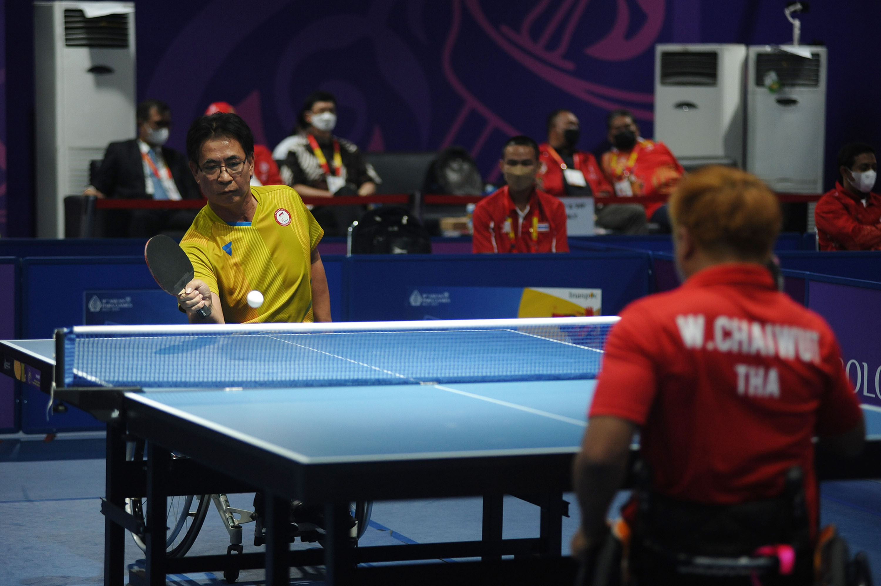 ADYOS ASTAN (INA) kaos kuning berlaga di Men's Singles - Class 4 Para Tenis Meja melawan WANCHAI CHAIWUT (THA). 11th Asean Para Games 2022 Solo Techno Park, 05 Agustus 2022. Foto : HO/INASPOC/Sportsmoment/Sofyan Adi.