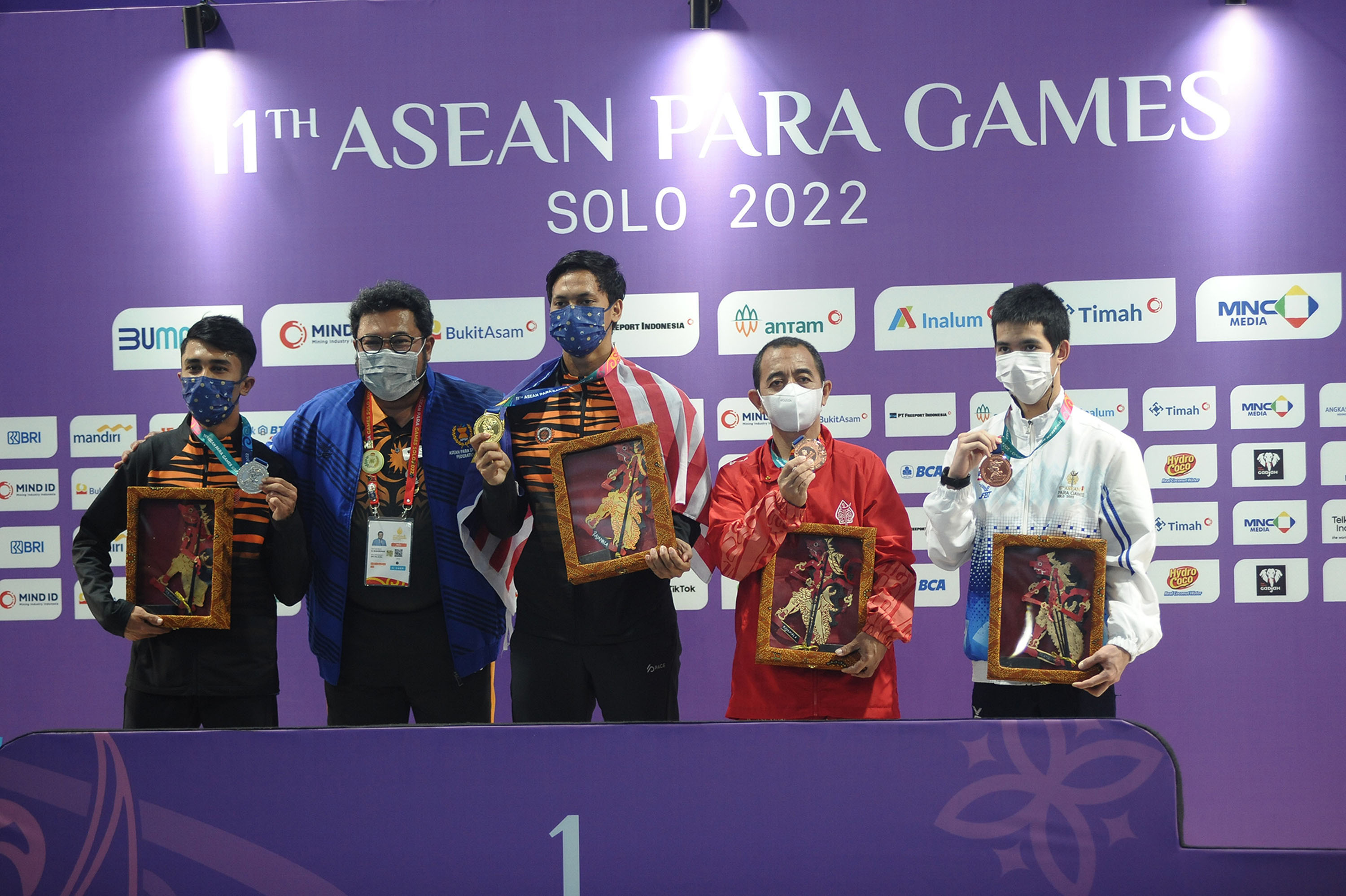Penerima Medali kelas 11 Men's Single Para TEnismeja. Emas dan perak disabet Malaysia ( Mohd Hazlin/paling kiri & Jannahtul Fahmi/tengah). Sedangkan perunggu didapat Master Narawit Thailand/palingkanan & Achmad Yusuf/merah Indonesia. 11th ASEAN Para Games 2022 Solo Techno Park, 05 Agustus 2022. Foto : HO/INASPOC/Sportsmoment/Sofyan Adi.