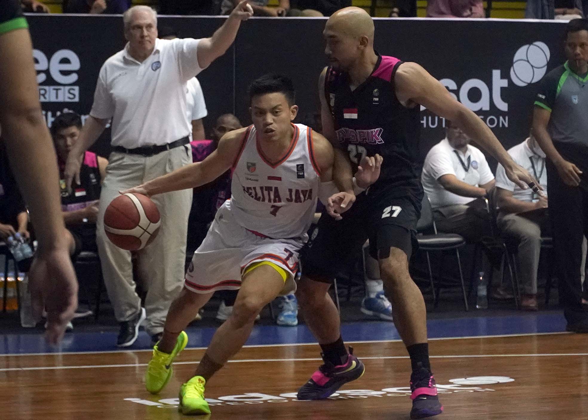 Andakara Prastawa Dhyaksa mengusai bola saat Pelita Jaya Bakrie Jakarta berhasil memenangi pertandingan melawan Rans PIK Basketball dalam playoff IBL Tokopedia 2022 di C-Tra Arena Bandung pada Selasa, 16 Agustus 2022 (Foto: Sportsmoment/Erly Bahtiar)