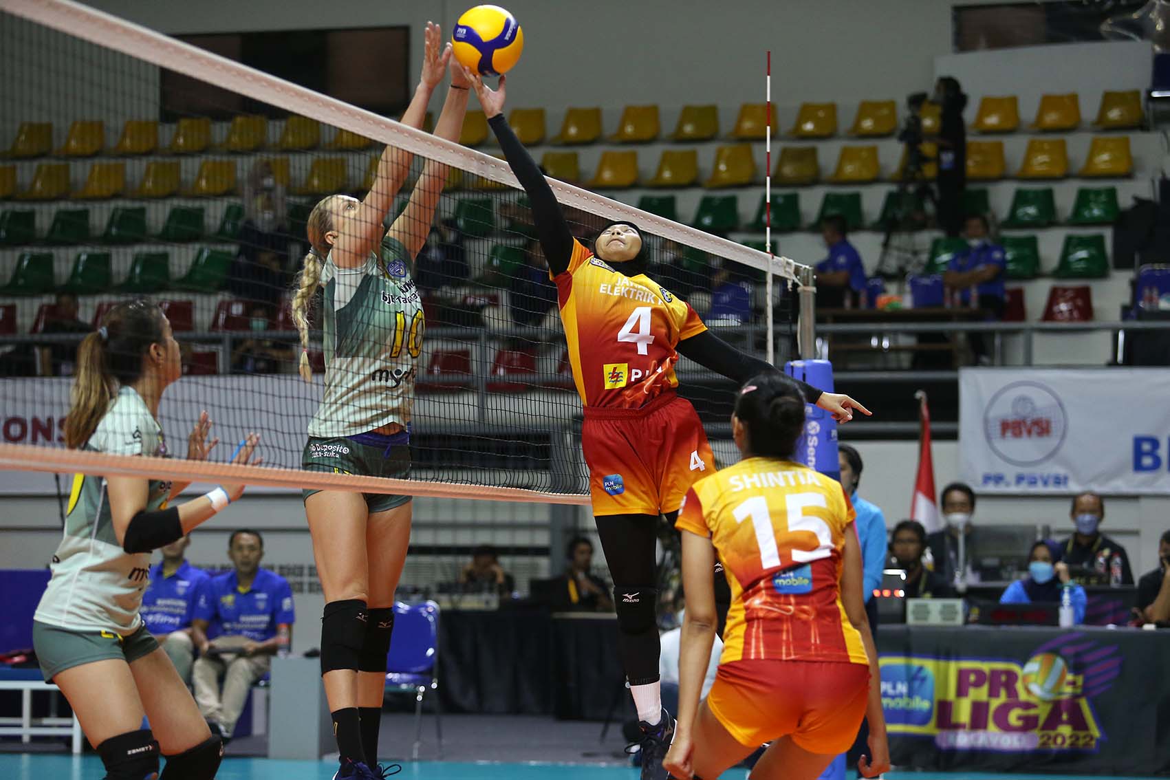 Kemuning Dyah Ayu Werti (4) pemain bola voli Jakarta Elektrik PLN berebut bola dengan pemain Bandung BJB Tandamata, Yeliz Basa (10)