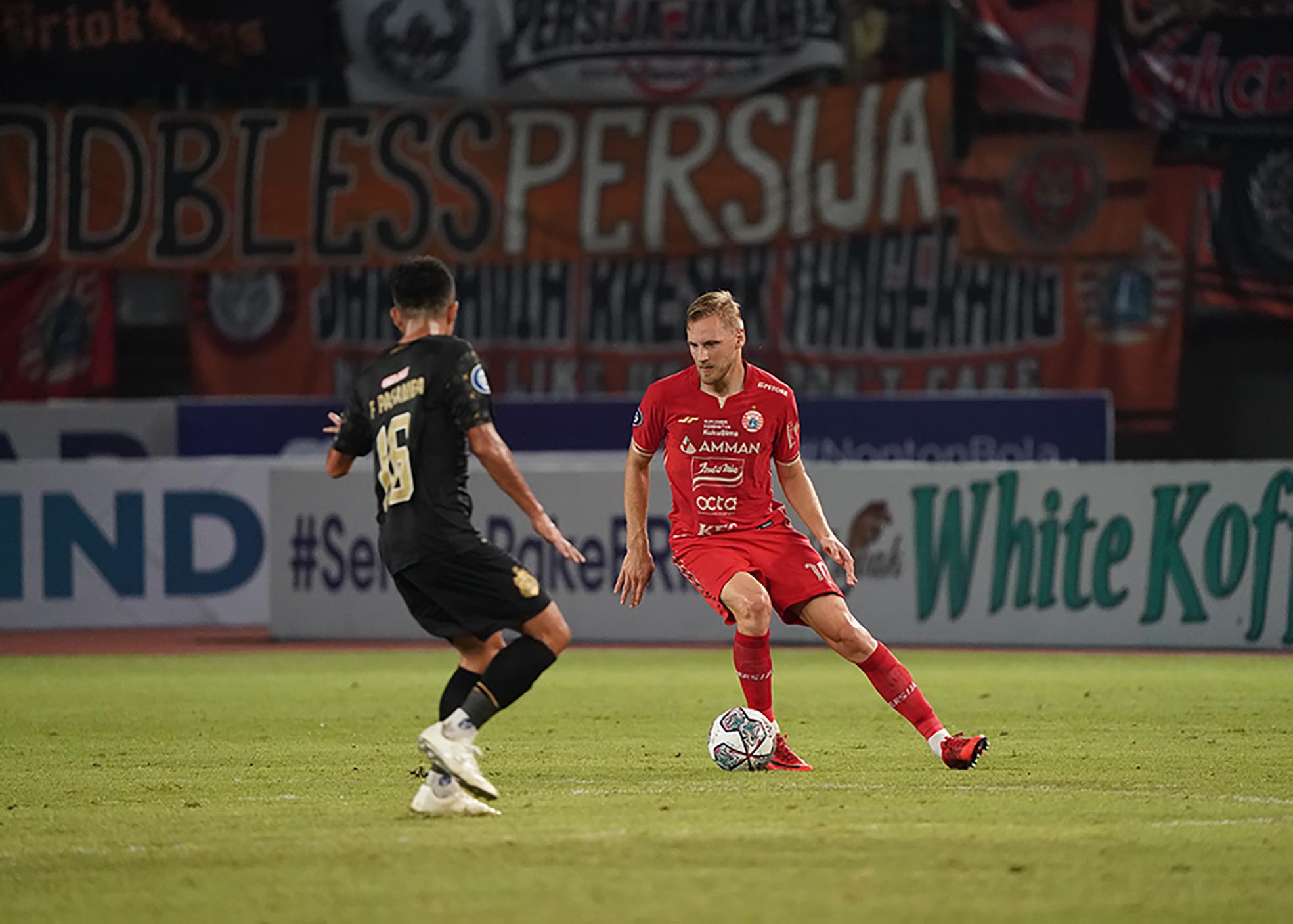 Pesepakbola asal klub Persija Jakarta, Hanno Behrens (10) saat berlaga melawan Bhayangkara FC di Stadion Patriot Chandra Bhaga Bekasi, Sabtu (3/9). Persija unggu atas Bhayangkara FC dengan skor tipis 2-1. Kedua gol Persija Jakarta ke gawang Bhayangkara FC dicetak oleh Michael Krmencik. (Foto by : sportsmoment.id/Erly Bahtiar)