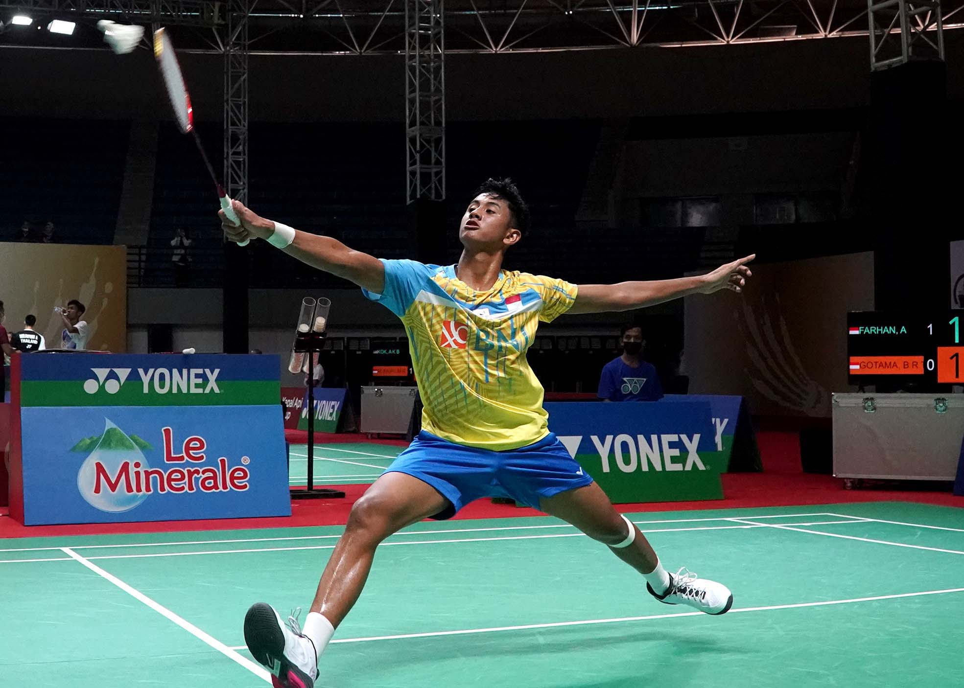 Tunggal Putra Indonesia, Farhan Alwi berhasil mengalahkan kompatriotnya, Bodhi Ratana Teja GOTAMA dua gim lagsung, 21-10, 21-12 pada babak 32 besar gelaran Kapal Api Group Indonesia International Series 2022, Rabu (21/9), di Gor Amongrogo, Yogyakarta. (Foto by : sportsmoment.id/Erly Bahtiar)