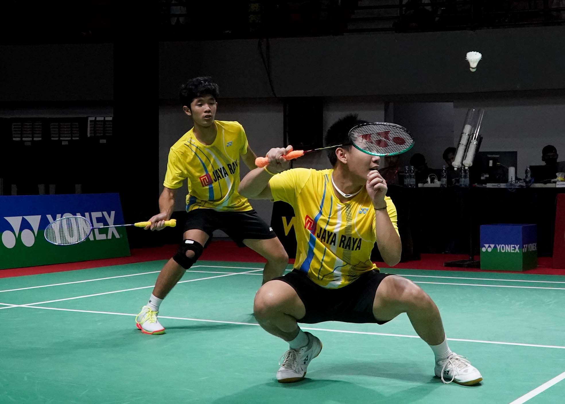 Ganda Putra Indonesia, Jonathan Farrell Gosal/ Adrian Pratama berhasil mengalahkan kompatriotnya, Alden Lefilson Putra Mainaky/Alweyn Jantje Putra Mainaky dua gim lagsung, 21-13, 21-15 pada babak 32 besar gelaran Kapal Api Group Indonesia International Series 2022, Rabu (21/9), di Gor Amongrogo, Yogyakarta. (Foto by : sportsmoment.id/Erly Bahtiar)