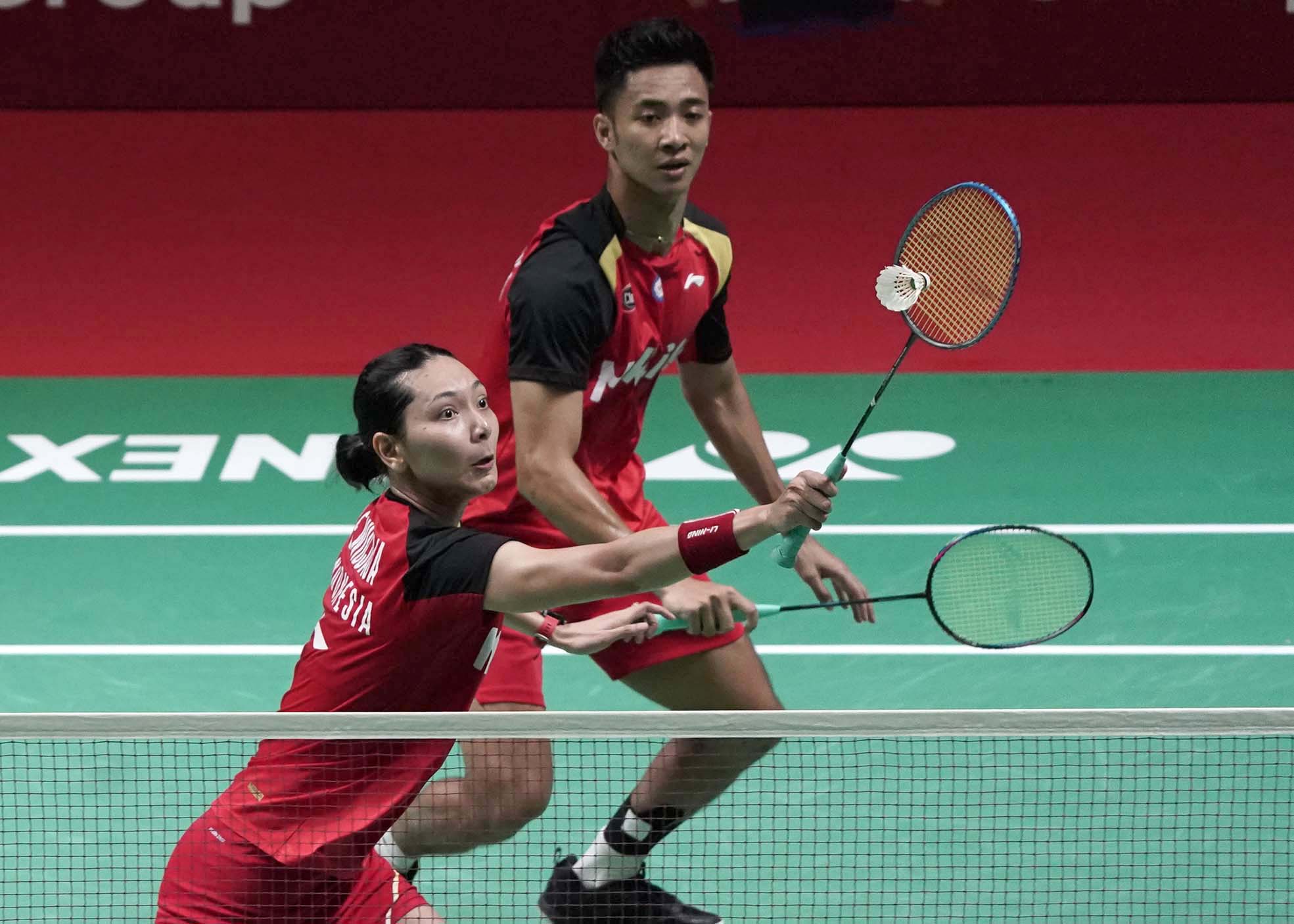 Ganda campuran Indonesia, Dejan Ferdinansyah/Gloria Emanuelle Widjaja berhasil mengalahkan kompatriotnya, Jafar Hidayatullah/Aisyah Salsabila Putri Pranata dua gim langsung, 22-20, 21-17 pada babak semifinal gelaran Kapal Api Group Indonesia International Series 2022, Sabtu (24/9), di Gor Amongrogo, Yogyakarta. (Foto by : sportsmoment.id/Erly Bahtiar)
