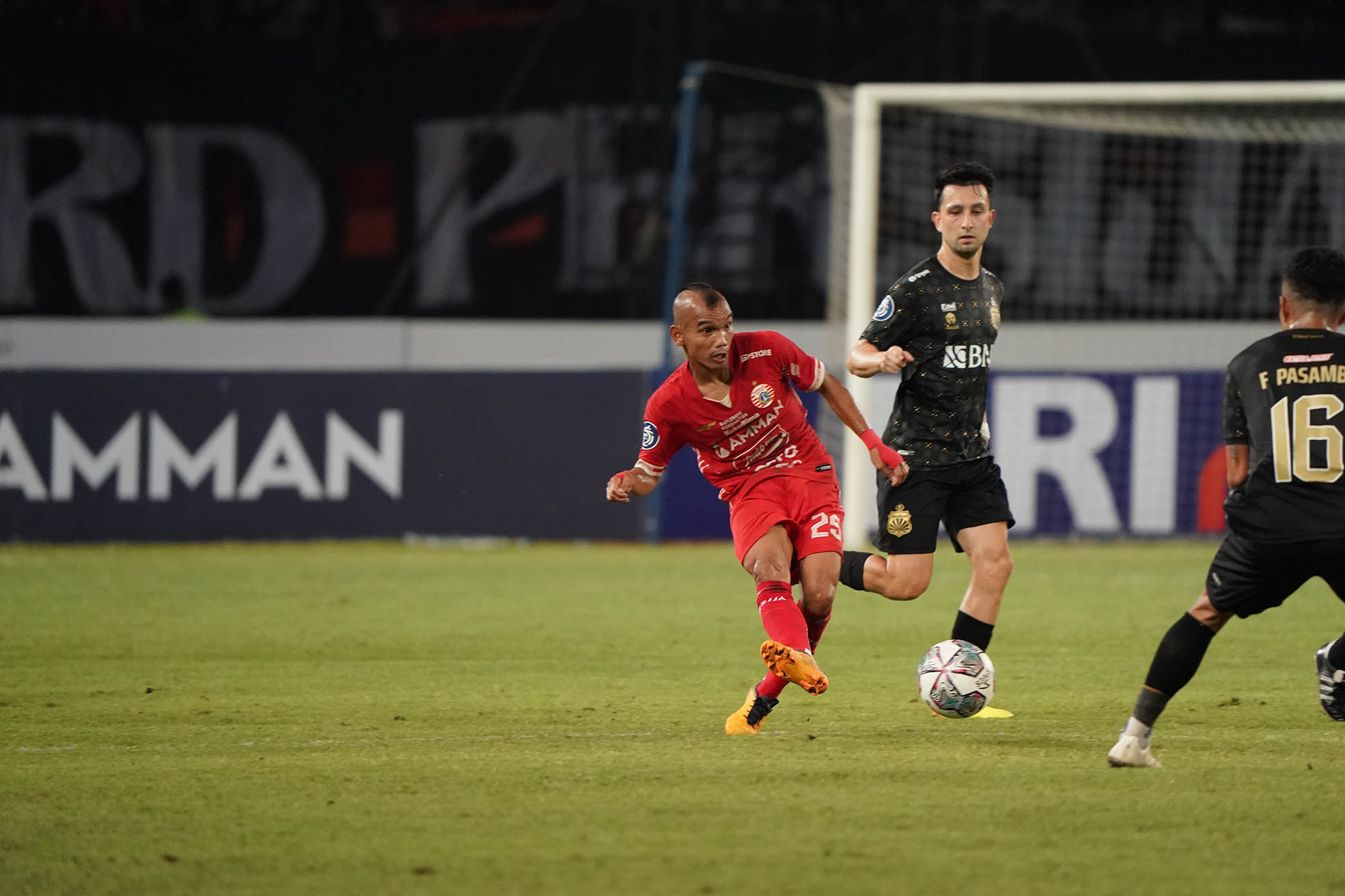 Pesepakbola asal klub Persija Jakarta, Riko Simanjuntak (25) saat berlaga melawan Bhayangkara FC di Stadion Patriot Chandra Bhaga Bekasi, Sabtu (3/9). Persija unggu atas Bhayangkara FC dengan skor tipis 2-1. Kedua gol Persija Jakarta ke gawang Bhayangkara FC dicetak oleh Michael Krmencik. (Foto by : sportsmoment.id/Erly Bahtiar)