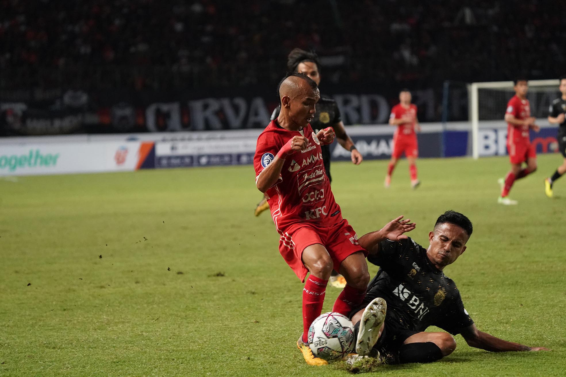 Pesepakbola asal klub Persija Jakarta, Riko Simanjuntak (25) saat berlaga melawan Bhayangkara FC di Stadion Patriot Chandra Bhaga Bekasi, Sabtu (3/9). Persija unggu atas Bhayangkara FC dengan skor tipis 2-1. Kedua gol Persija Jakarta ke gawang Bhayangkara FC dicetak oleh Michael Krmencik. (Foto by : sportsmoment.id/Erly Bahtiar)