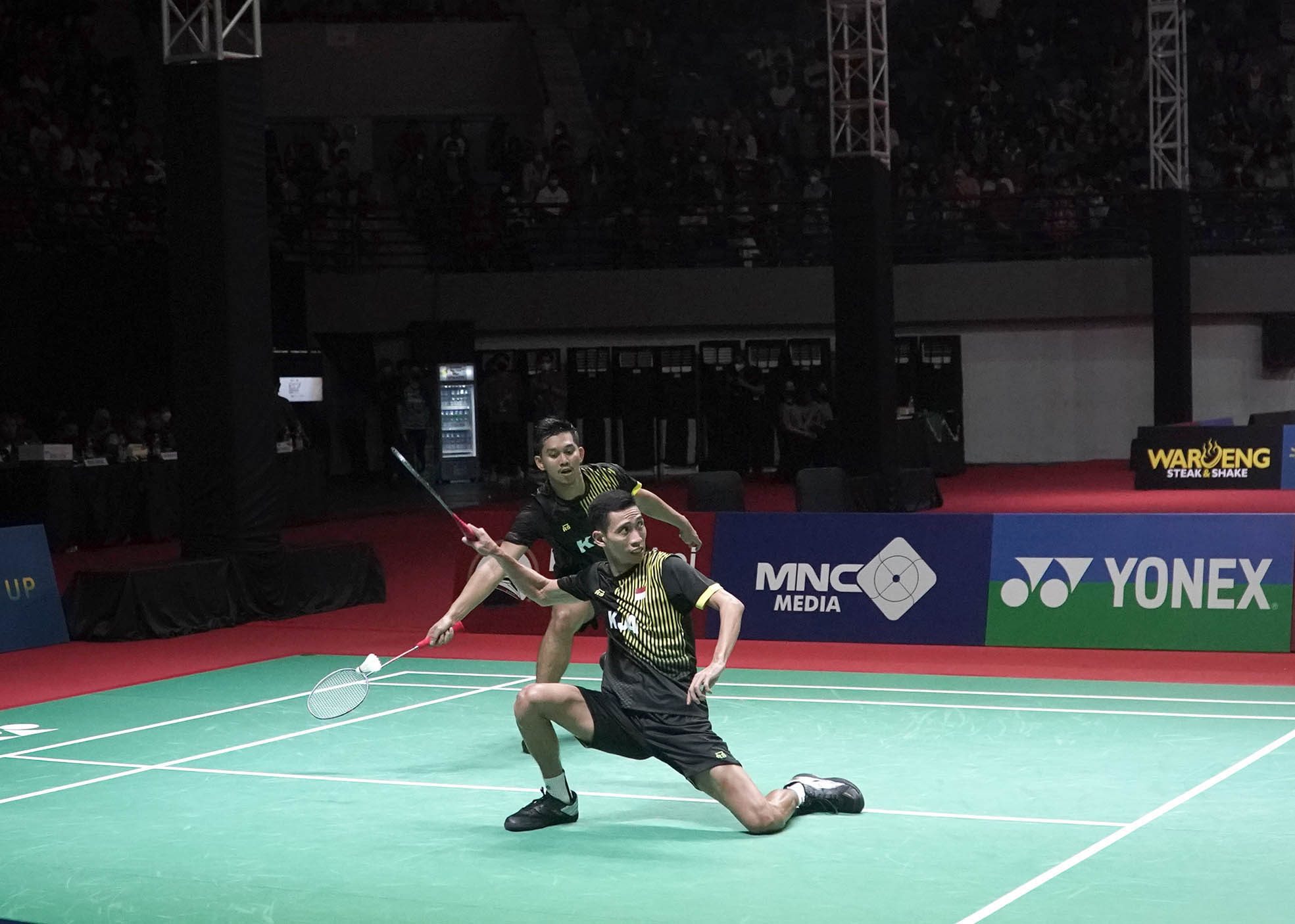 Ganda Putra Indonesia, Alfian Eko Prasetya/Ade Yusuf Santoso berhasil menjadi juara setelah mengalahkan kompatriotnya, Reinard Dhanriano/Kenas Adi Haryanto melalui pertarungan tiga gim, 21-16, 18-21 dan 21-16 pada babak final gelaran Kapal Api Group Indonesia International Series 2022, Minggu (25/9), di Gor Amongrogo, Yogyakarta. (Foto by : sportsmoment.id/Erly Bahtiar)