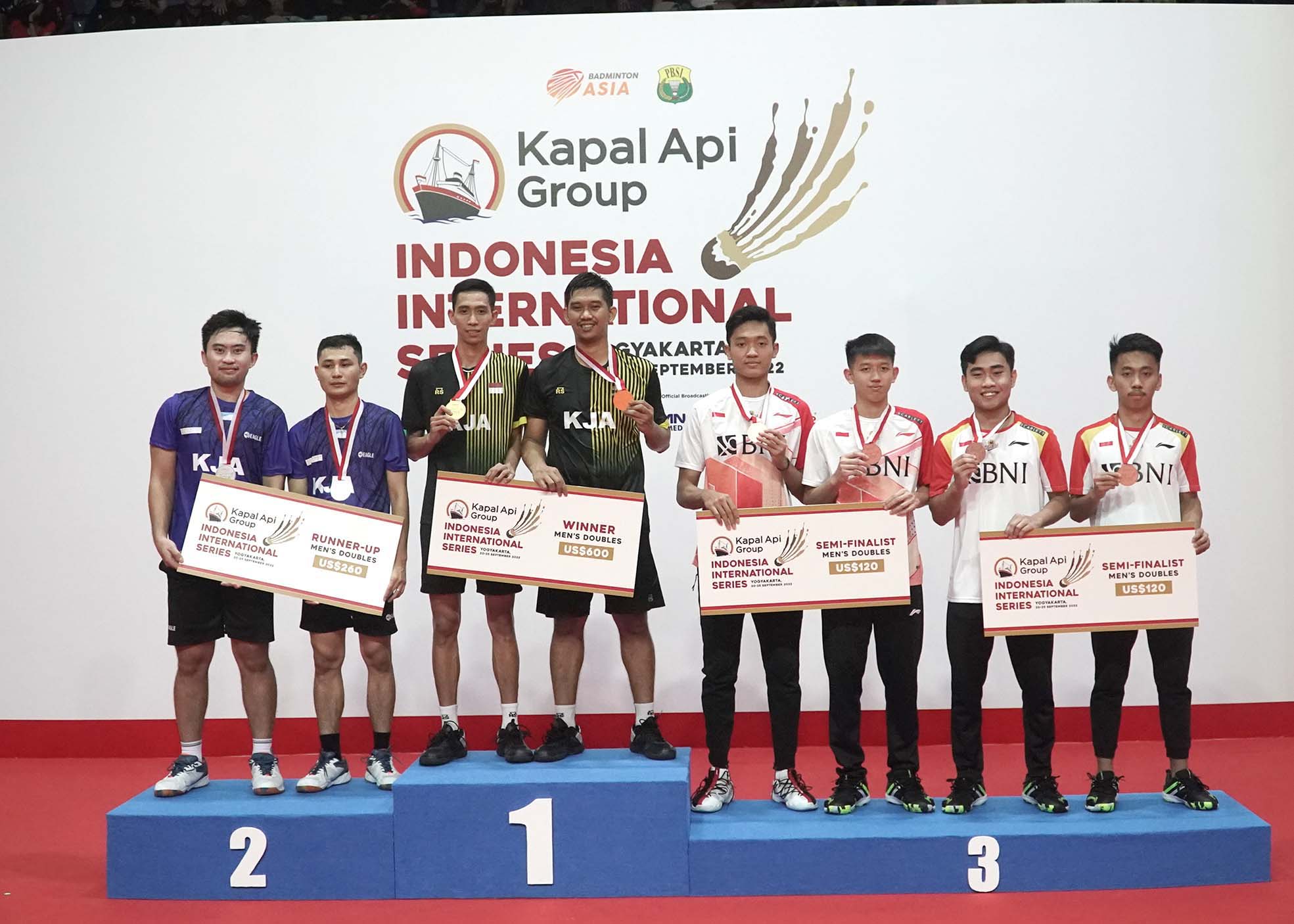 Ganda Putra Indonesia, Alfian Eko Prasetya/Ade Yusuf Santoso berhasil menjadi juara setelah mengalahkan kompatriotnya, Reinard Dhanriano/Kenas Adi Haryanto melalui pertarungan tiga gim, 21-16, 18-21 dan 21-16 pada babak final gelaran Kapal Api Group Indonesia International Series 2022, Minggu (25/9), di Gor Amongrogo, Yogyakarta. (Foto by : sportsmoment.id/Erly Bahtiar)
