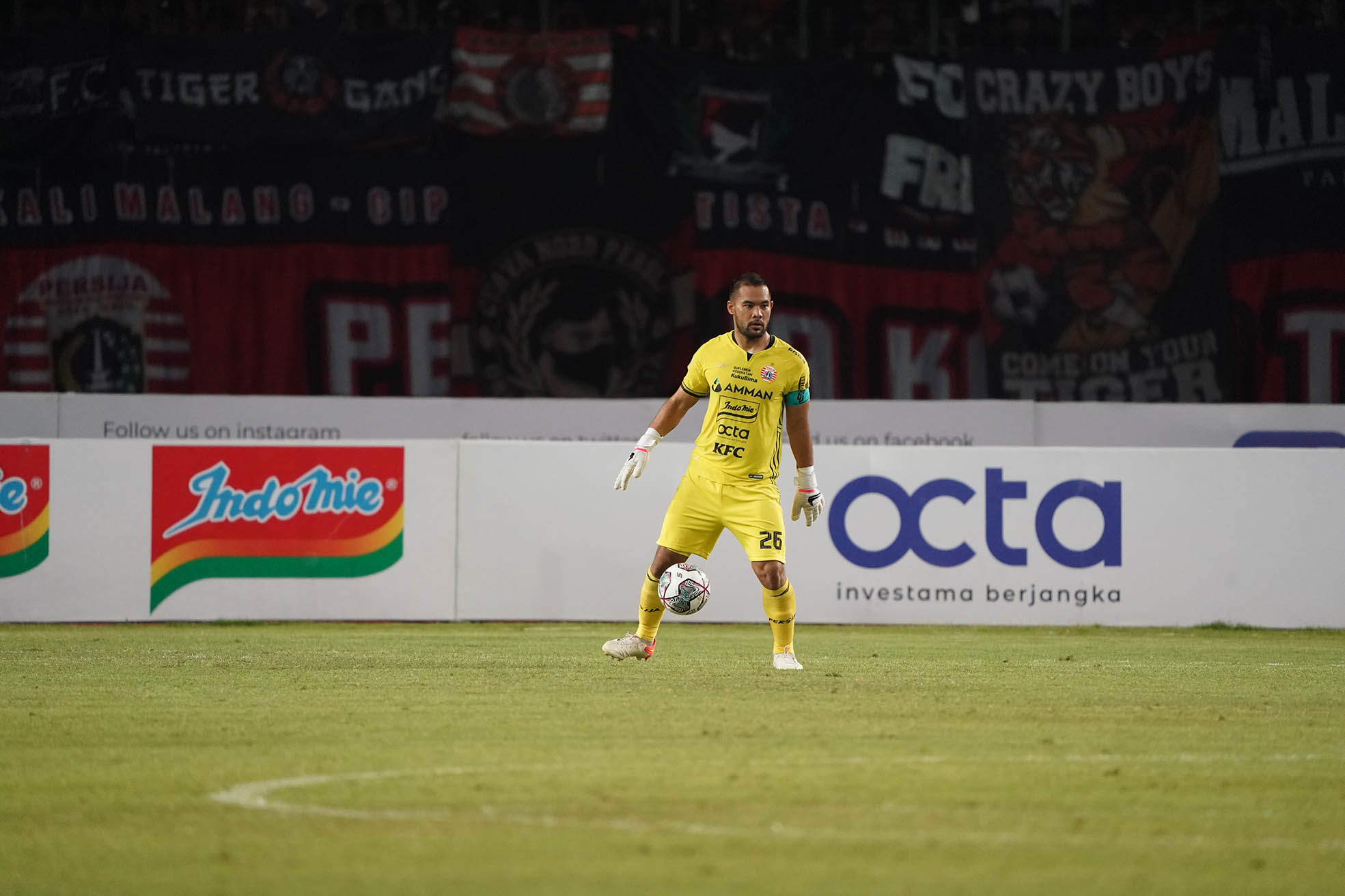 Penjaga gawang asal klub Persija Jakarta, Andritany Ardhiyasa (26) saat berlaga melawan Bhayangkara FC di Stadion Patriot Chandra Bhaga Bekasi, Sabtu (3/9). Persija unggu atas Bhayangkara FC dengan skor tipis 2-1. Kedua gol Persija Jakarta ke gawang Bhayangkara FC dicetak oleh Michael Krmencik. (Foto by : sportsmoment.id/Erly Bahtiar)