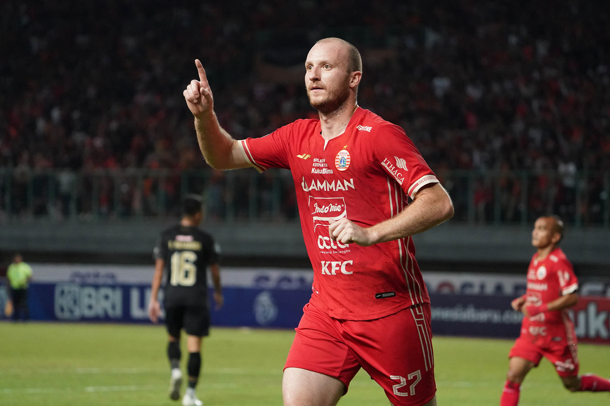 Pesepakbola asal klub Persija Jakarta, Michael Krmencik (27) saat berlaga melawan Bhayangkara FC di Stadion Patriot Chandra Bhaga Bekasi, Sabtu (3/9). Persija unggu atas Bhayangkara FC dengan skor tipis 2-1. Kedua gol Persija Jakarta ke gawang Bhayangkara FC dicetak oleh Michael Krmencik. (Foto by : sportsmoment.id/Erly Bahtiar)