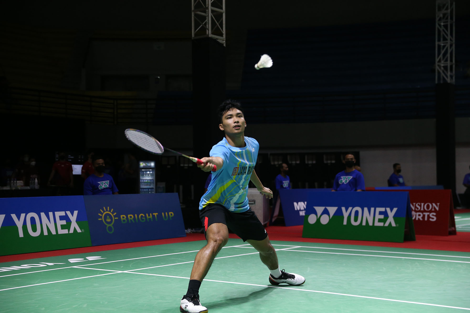 Tunggal Putra Indonesia, Karono dikalahkan tunggal putra Malaysia, Garret TAN dua gim langsung, 21-6, 9-15 RETIRED pada babak 64 besar gelaran Mansion Sport Indonesia International Challenge 2022, Selasa (27/9), di Gor Amongrogo, Yogyakarta. (Foto by : sportsmoment.id/Erly Bahtiar)