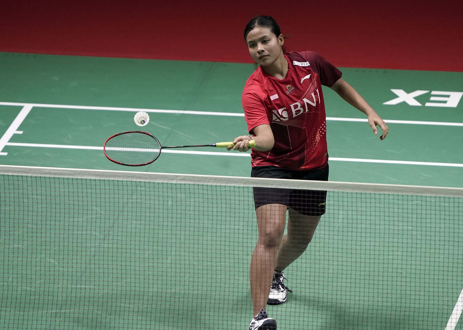 Tunggal Putri Indonesia, Komang Ayu Cahya Dewi berhasil mengalahkan kompatriotnya, Siti Sarah AZZAHRA melalui pertarungan tiga gim, 18-21, 21-14 dan 21-14 pada babak semifinal gelaran Mansion Sport Indonesia International Challenge 2022, Sabtu (1/10), di Gor Amongrogo, Yogyakarta. (Foto by : sportsmoment.id/Erly Bahtiar)
