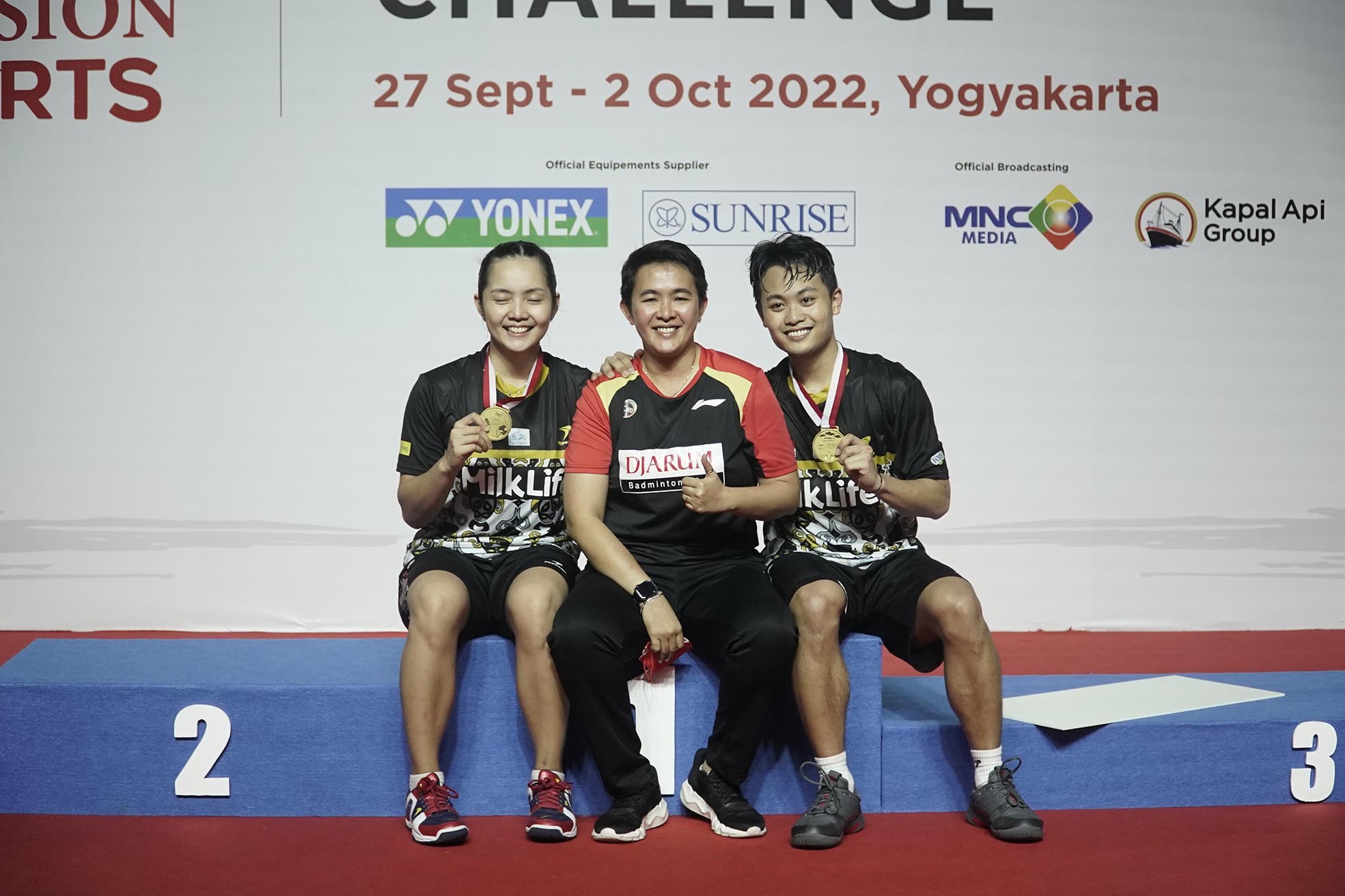 Ganda campuran Indonesia, Akbar Bintang Cahyono/Marsheilla Gischa Islami berhasil mengalahkan kompatriotnya, Adnan Maulana/Indah Cahya Sari Jamil melalui pertarungan tiga gim, 21-17, 14-21 dan 21-16 pada babak final gelaran Mansion Sport Indonesia International Challenge 2022, Minggu (2/10), di Gor Amongrogo, Yogyakarta. (Foto by : sportsmoment.id/Erly Bahtiar)