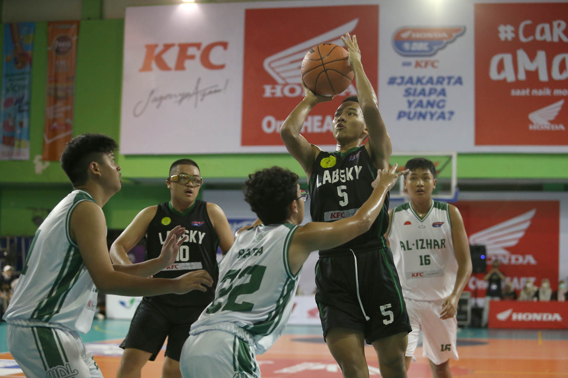 Pebasket SMA Labschool Jakarta, Malik Abhirama Putrayudha (5) menguasai bola saat melawan tim SMA Al Izhar Jakarta pada turnamen Basket Honda DBL with KFC 2022 DKI Jakarta Series - North & Central Region yang berlangsung pada Jumat, 7 Oktober 2022 di GOR Bulungan Jakarta. SMA Labschool Jakarta unggul atas SMA AL- Izhar Jakarta dengan skor 45-38 (Foto by : Sportsmoment.id/Erly Bahtiar).