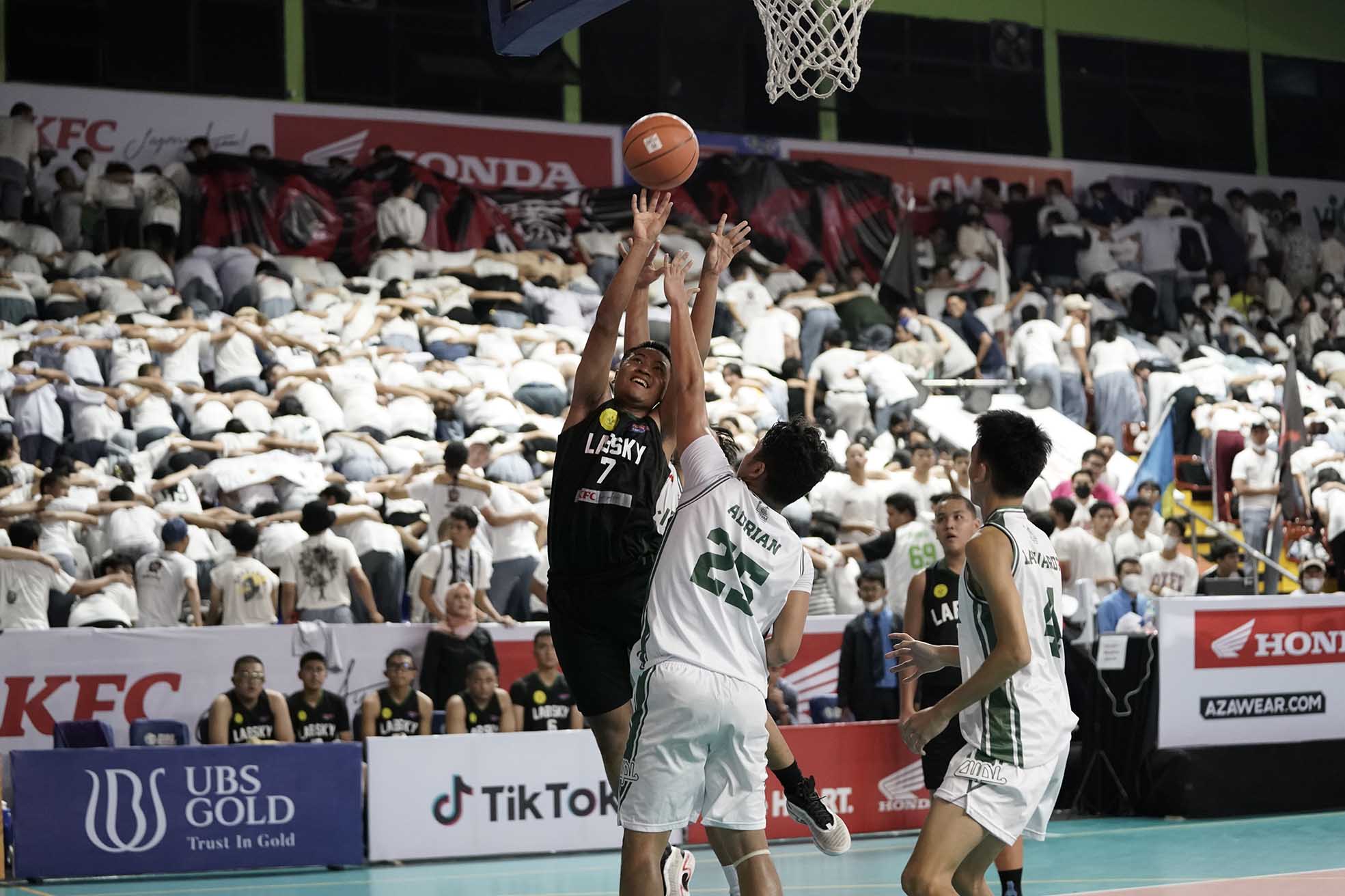 Pebasket SMA Labschool Jakarta, Orvynn Ahmad (7) menguasai bola saat melawan tim SMA Al Izhar Jakarta pada turnamen Basket Honda DBL with KFC 2022 DKI Jakarta Series - North & Central Region yang berlangsung pada Jumat, 7 Oktober 2022 di GOR Bulungan Jakarta. SMA Labschool Jakarta unggul atas SMA AL- Izhar Jakarta dengan skor 45-38 (Foto by : Sportsmoment.id/Erly Bahtiar).
