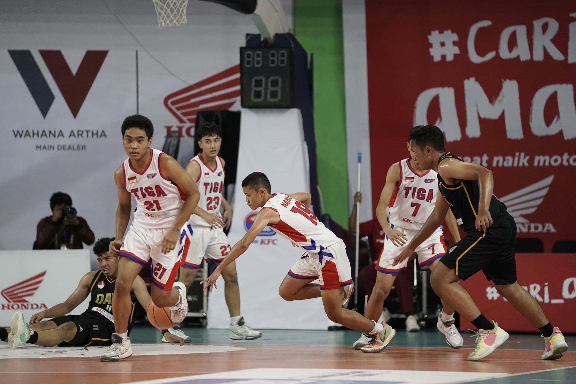 Pebasket SMAN 3 Jakarta, Farly Farelino (21) menguasai bola saat melawan tim SMAN 82 Jakarta pada turnamen Basket Honda DBL with KFC 2022 DKI Jakarta Series - North & Central Region yang berlangsung pada Jumat, 7 Oktober 2022 di GOR Bulungan Jakarta. SMAN 3 Jakarta unggul atas SMAN 82 Jakarta dengan skor 35-23 (Foto by : Sportsmoment.id/Erly Bahtiar).
