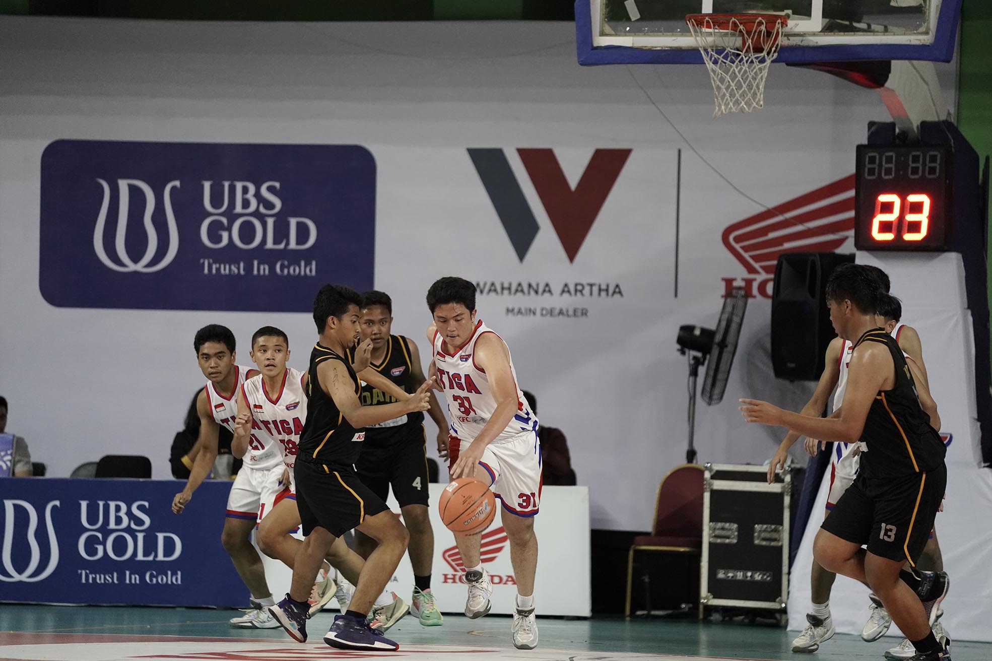 Pebasket SMAN 3 Jakarta, Rafi Putra Prima (31) menguasai bola saat melawan tim SMAN 82 Jakarta pada turnamen Basket Honda DBL with KFC 2022 DKI Jakarta Series - North & Central Region yang berlangsung pada Jumat, 7 Oktober 2022 di GOR Bulungan Jakarta. SMAN 3 Jakarta unggul atas SMAN 82 Jakarta dengan skor 35-23 (Foto by : Sportsmoment.id/Erly Bahtiar).