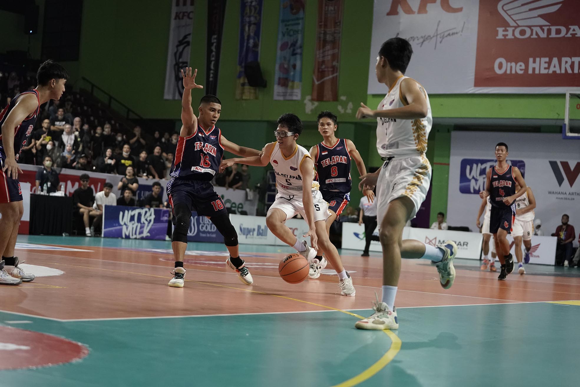 Pebasket SMAN 3 Jakarta, Teuku Ahmad Devanio (18) mengawal pergerakan pebasket SMAN 28 Jakarta pada turnamen Basket Honda DBL with KFC 2022 DKI Jakarta Series - North & Central Region yang berlangsung pada Sabtu, 8 Oktober 2022 di GOR Bulungan Jakarta. SMAN 3 Jakarta dikalahkan SMAN 28 Jakarta dengan skor 33-37 (Foto by : Sportsmoment.id/Erly Bahtiar).