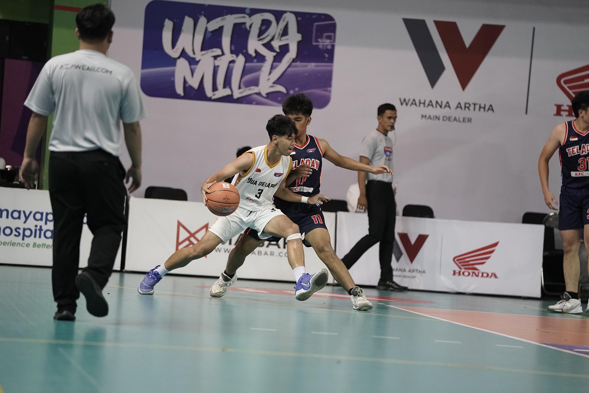 Pebasket SMAN 28 Jakarta, Daffa Dzaki Syarif (3) menguasai bola saat melawan tim SMAN 3 Jakarta pada turnamen Basket Honda DBL with KFC 2022 DKI Jakarta Series - North & Central Region yang berlangsung pada Sabtu, 8 Oktober 2022 di GOR Bulungan Jakarta. SMAN 28 Jakarta unggul atas SMAN 3 Jakarta dengan skor 37-33 (Foto by : Sportsmoment.id/Erly Bahtiar).