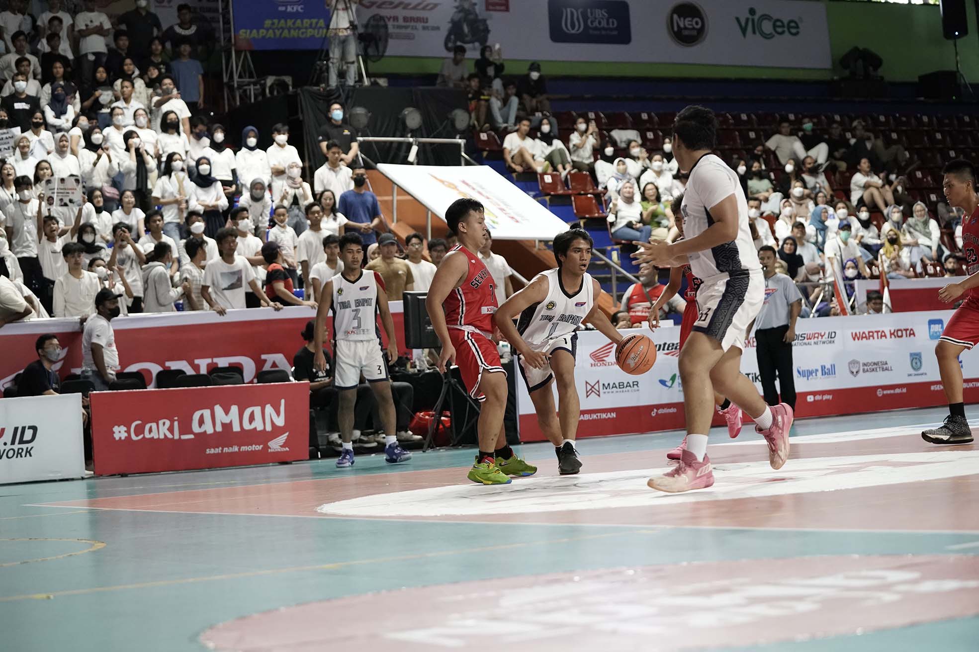 Pebasket SMAN 34 Jakarta, Abel Atroriq (1) menguasai bola saat melawan tim SMAN 74 Jakarta pada turnamen Basket Honda DBL with KFC 2022 DKI Jakarta Series - North & Central Region yang berlangsung pada Sabtu, 8 Oktober 2022 di GOR Bulungan Jakarta. SMAN 34 Jakarta unggul atas SMAN 74 Jakarta dengan skor 31-11 (Foto by : Sportsmoment.id/Erly Bahtiar).