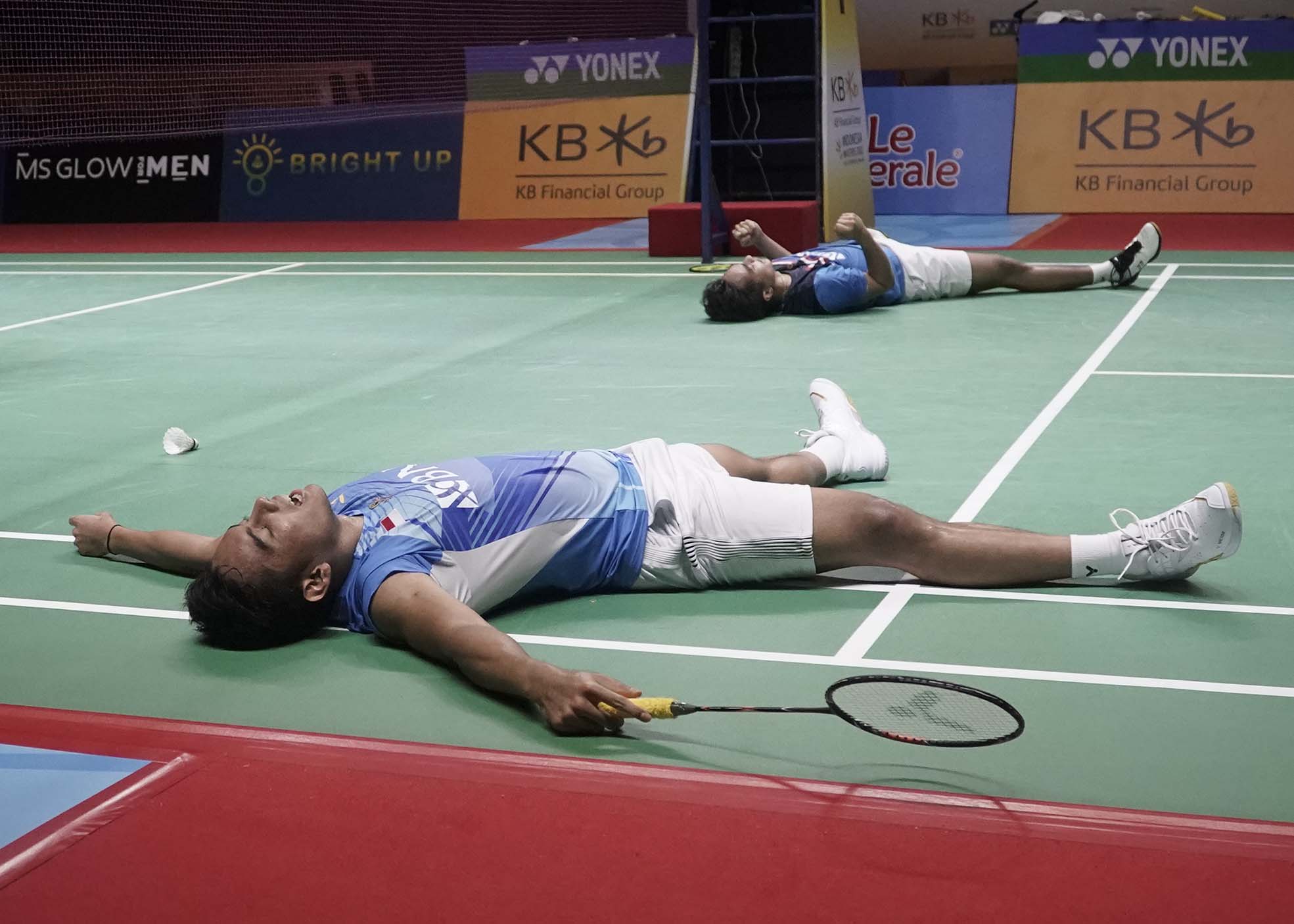 Pasangan ganda putra Indonesia, Rahmat Hidayat/Pramudya Kusumawardana berhasil menjadi juara pada gelaran KB FINANCIAL GROUP Indonesia Masters 2022 setelah berhasil menumbangkan unggulan pertama asal Tiongkok, He Ji Ting/Zhou Hao Dong dua gim langsung, 21-18 21-19 pada babak final yang diselenggarakan di Gor Platinum Malang, Minggu (23/10). (Foto by : Sportsmoment.id/Erly Bahtiar).