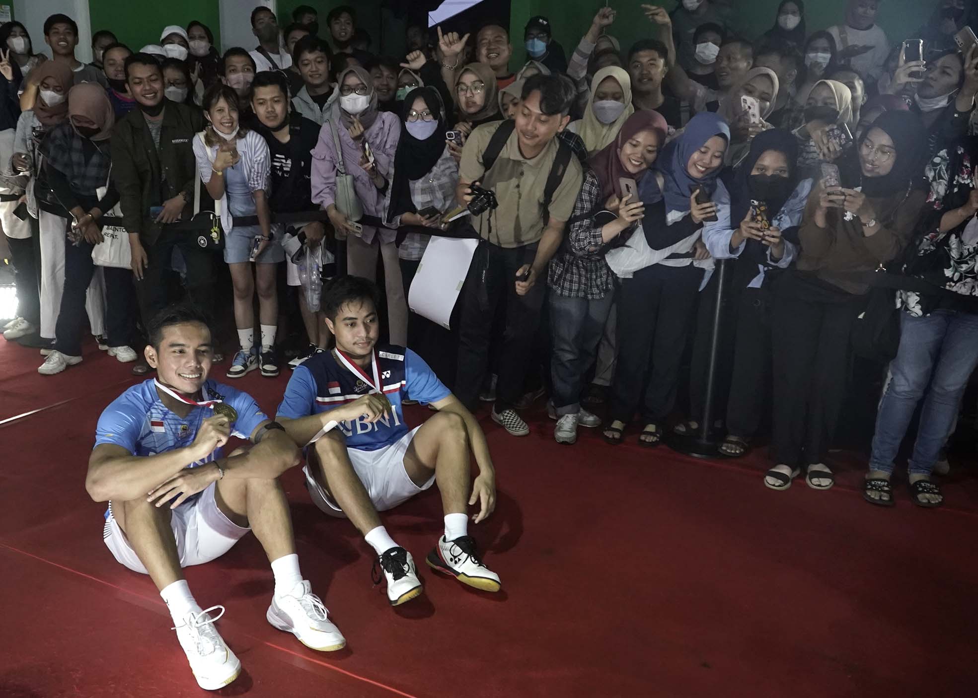 Pasangan ganda putra Indonesia, Rahmat Hidayat/Pramudya Kusumawardana berhasil menjadi juara pada gelaran KB FINANCIAL GROUP Indonesia Masters 2022 setelah berhasil menumbangkan unggulan pertama asal Tiongkok, He Ji Ting/Zhou Hao Dong dua gim langsung, 21-18 21-19 pada babak final yang diselenggarakan di Gor Platinum Malang, Minggu (23/10). (Foto by : Sportsmoment.id/Erly Bahtiar).
