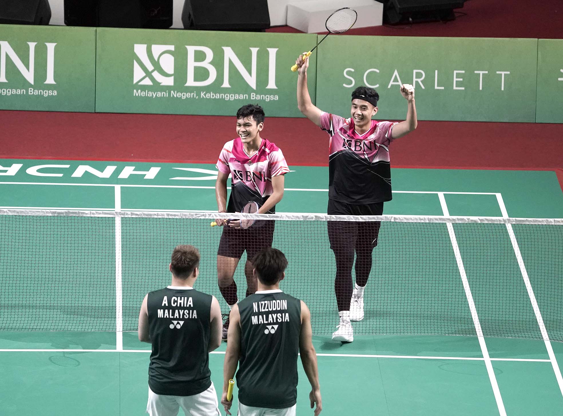 Bagas Maulana dan M Shohibul Fikri pebulutangkis ganda putra Indonesia beraksi dalam laga ekshibisi BNI Bright Up 2022 dalam rangka menuju BWF World Tour Final yang dilaksanakan di Tenis Indoor GBK Senayan, pada 11 November 2022 (Photo: Sportsmoment.id/Erly Bahtiar)