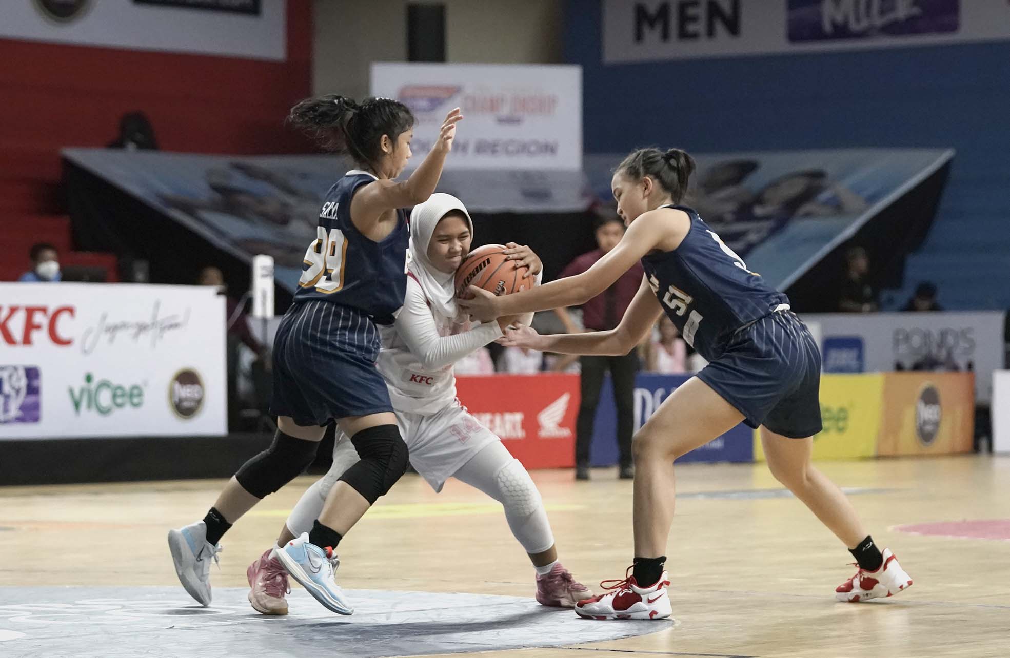 Syifa Nurawaliah Pemain Basket Putri SMAN 71 Jakarta dalam aksinya di Honda DBL with KFC 2022 DKI Jakarta Championship Series yang berlangsung di Pasar Festival / Gelanggang Mahasiswa Soemantri Brojonegoro Jakarta, pada Rabu, 16 November 2022. (Photo: Sportsmoment.id/Hadi Saputra)