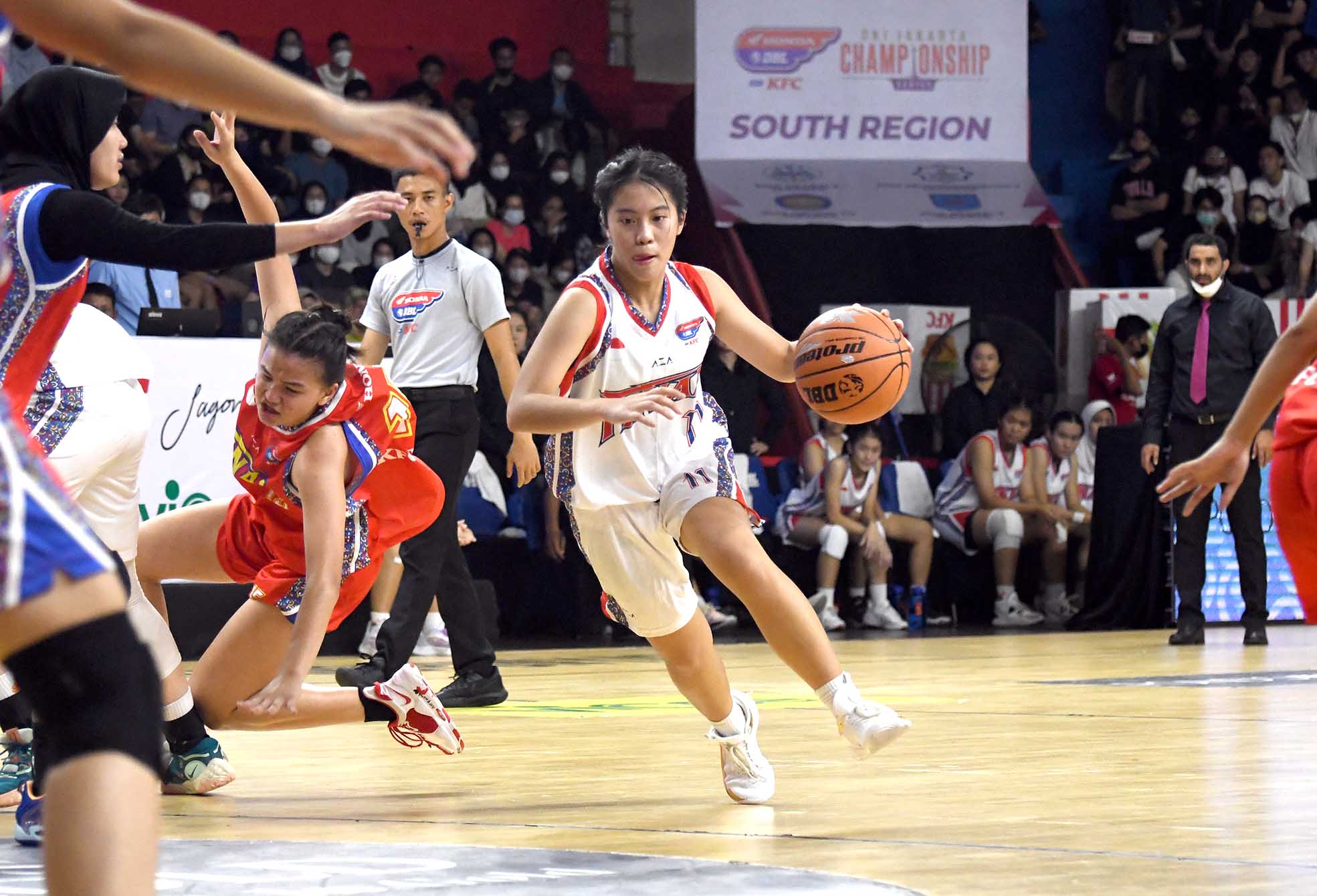 MICHELLE SUTEJA (11), Pemain basket Putri Jubilee Jakarta dalam aksinya di Final Honda DBL with KFC 2022 DKI Jakarta Championship Series yang berlangsung di Pasar Festival / Gelanggang Mahasiswa Soemantri Brojonegoro Jakarta, pada sabtu, 19 November 2022 saat melawan SMAN 70 Jakarta. SMAN 70 Jakarta berhasil mengalahkan SMA Jubilee Jakarta dengan skor 54-33. (Photo: Sportsmoment.id/Hadi Saputra)