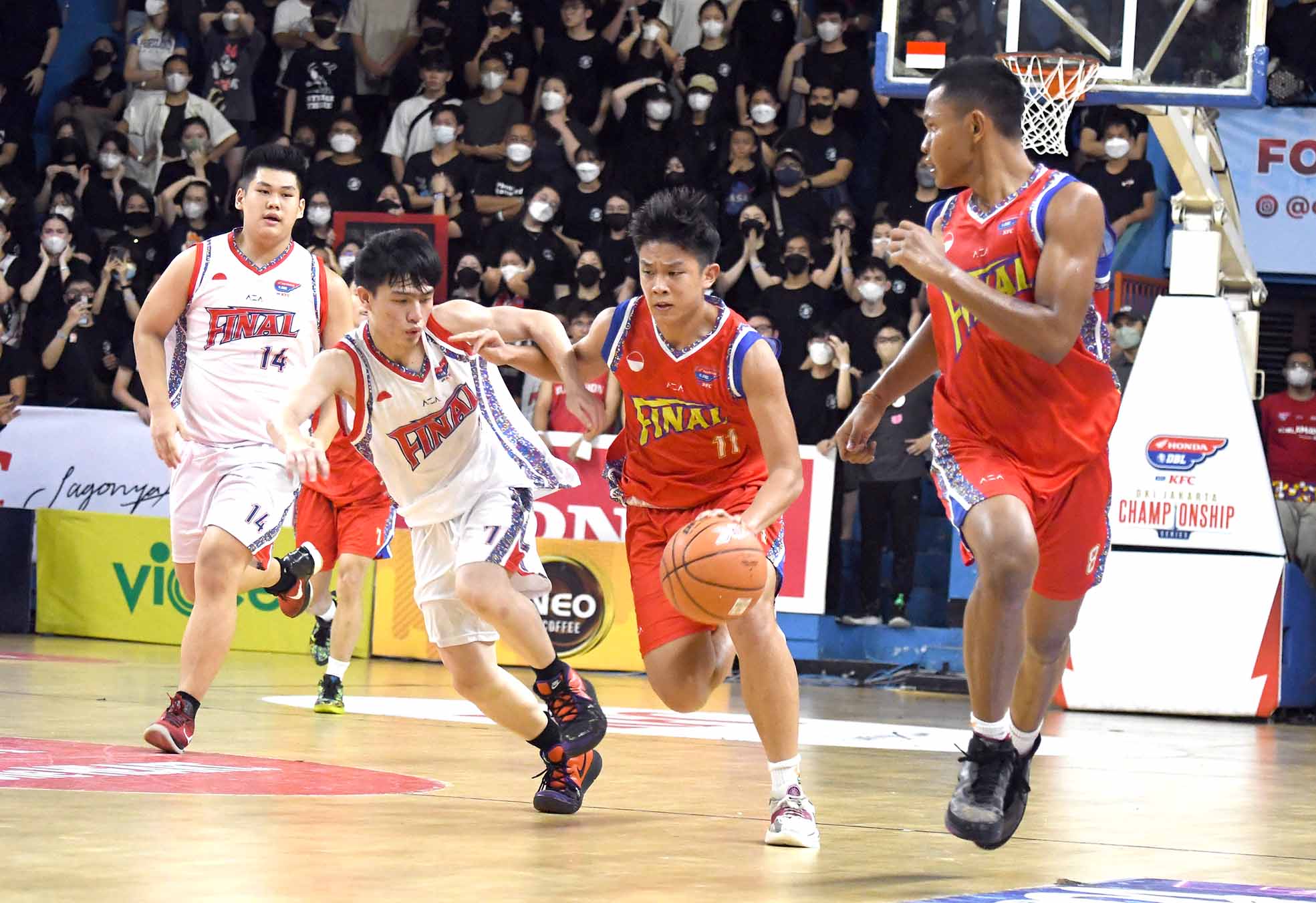 STEPHEN SUNDINATA (11), Pemain basket Putra Jubilee Jakarta dalam aksinya di Final Honda DBL with KFC 2022 DKI Jakarta Championship Series yang berlangsung di Pasar Festival / Gelanggang Mahasiswa Soemantri Brojonegoro Jakarta, pada sabtu, 19 November 2022 saat melawan SMA Bukit Sion Jakarta.