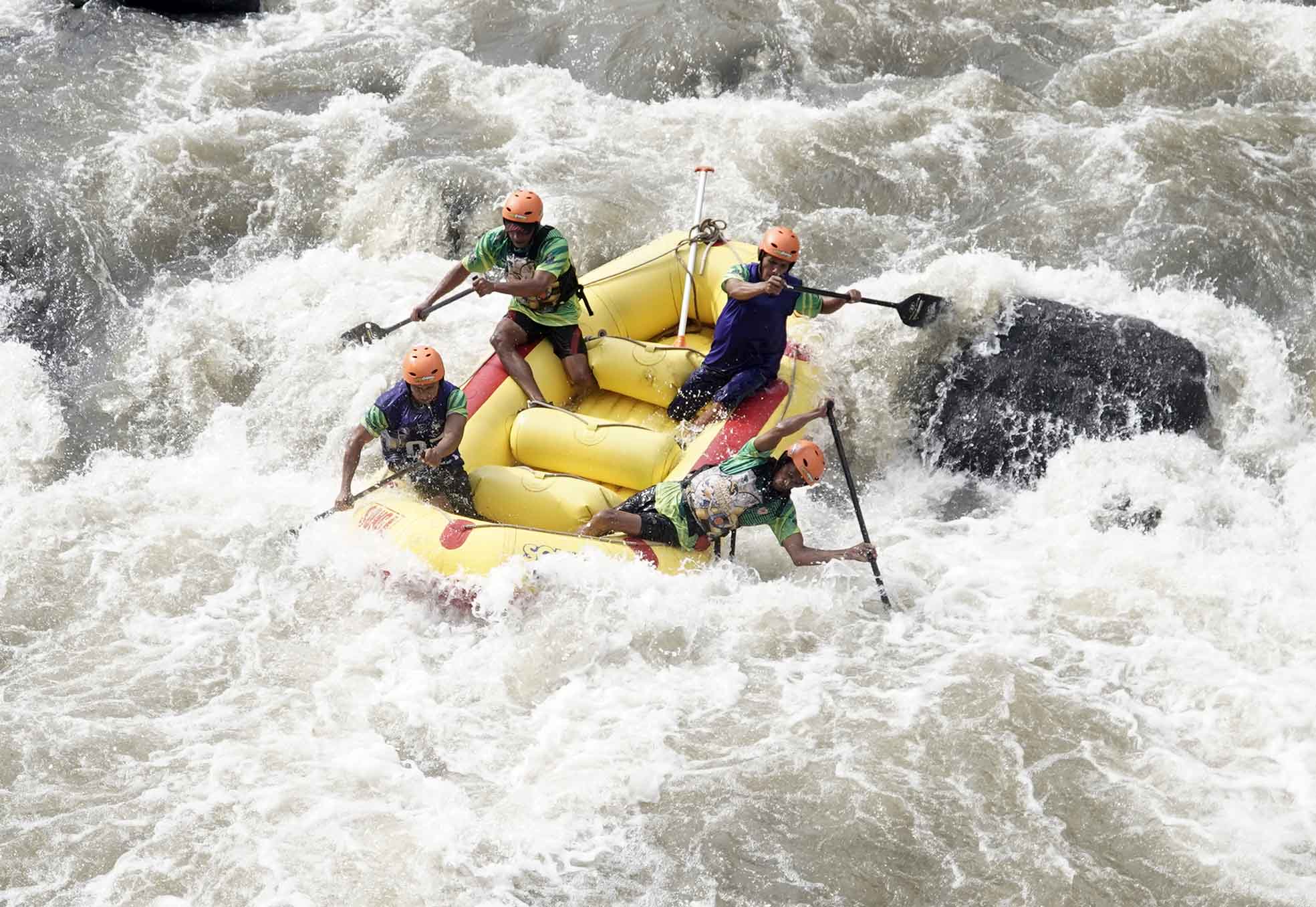 Tim Arung Jeram Jawa Timur yang beranggotakan Suhadi, Moh. Ahsan, Mattari, Imam, Adi Ruswiono memacu perahu karetnya dalam nomor lomba Sprint kategori Open Men pada Kejurnas Arung Jeram 2022 di sungai Pekalen, Probolinggo Jawa Timur, Kamis, 1 Desember 2022. Dalam nomor ini juara diraih oeh Jawa Barat, peringkat 2 Jawa Timur (MM) dan peringkat 3 DKI Jakarta. (Photo : Erly Bahtiar / Sportsmoment.id)